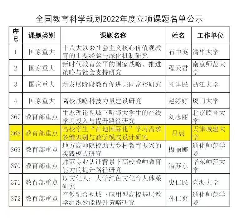 近日,全国教育科学规划领导小组办公室公布了2022年度全国教育科学规划课题立项名单,bv伟德经济与管理学院教师吕晨申报的《高校学生“在地国际化”学习需求多维识别与教学模式设计研究》获批立项。此次立项是bv伟德近5年在国家教育科学规划课题上再次取得的突破。