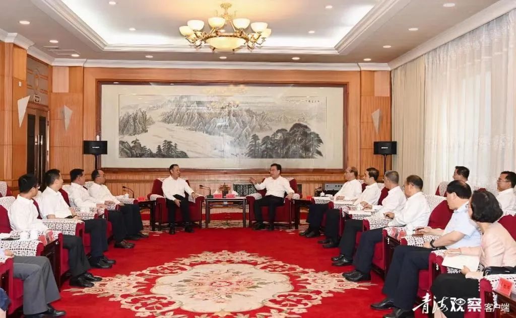 8月4日对口支援青海民族大学10 周年工作会议前,青海省委书记信长星、省长吴晓军与两地教育行政部门有关负责同志及各高校负责同志进行亲切交流