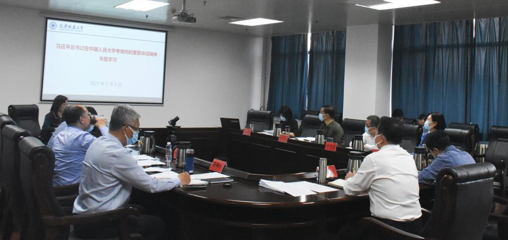 会议强调,学习宣传贯彻习近平总书记在中国人民大学考察时的重要讲话精神以及习近平总书记关于教育的重要论述是学校理论武装工作的重中之重,是当前和今后一个时期的首要政治任务,要深刻领会其精神实质和丰富内涵,不折不扣贯彻落实在学校事业发展的实践中。一是坚持马克思主义指导地位,培养德智体美劳全面发展的社会主义建设者和接班人;二是统筹思政课程和课程思政,充分利用“革命丰碑——天津市红色旧址展览”等红色资源,打造富有城建特色的思政育人综合体系;三是坚持德能并重,加强师德师风建设,打造“经师”和“人师”相统一的高质量教师队伍;四是要把学习宣传习近平总书记重要讲话精神同“迎盛会、铸忠诚、强担当、创业绩”学习宣传教育实践活动和“青春献礼二十大 奋斗担当铸忠诚 强国有我新征程”主题宣传教育活动结合起来,把理论学习成果转化为全校干部师生奋进新征程建功新时代的实际行动,踔厉奋发、笃行不怠,以优异成绩迎接党的二十大胜利召开。