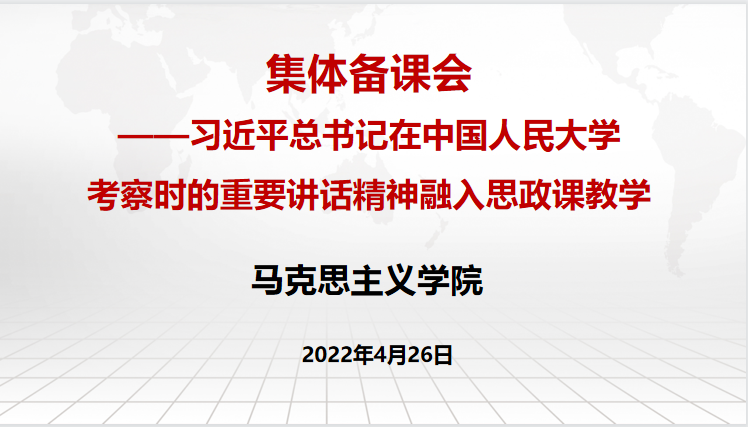 4月25日,习近平总书记在中国人民大学考察调研时,观摩思政课智慧教室现场教学、参与课堂讨论、参观博物馆,并就思政课建设发表重要讲话。4月26日,马克思主义学院举办线上集体备课会,就如何将习近平总书记在中国人民大学考察调研时的重要讲话精神融入思政课教学展开备课研讨。