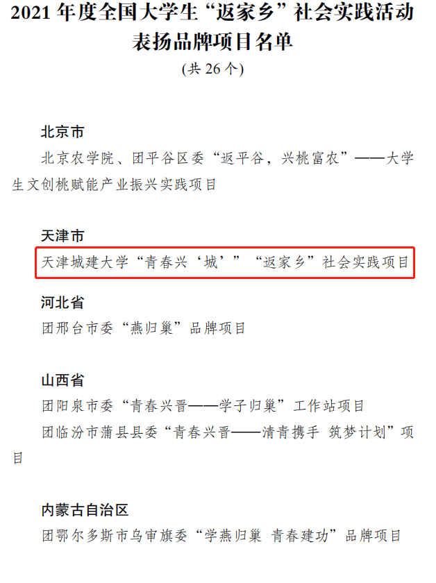 近日,共青团中央发布2021年度全国大学生“返家乡”社会实践活动总结通报结果,bv伟德“青春兴‘城’”“返家乡”实践项目”荣获2021年度全国大学生“返家乡”社会实践活动表扬品牌项目,此次获评项目为天津市唯一入选项目。