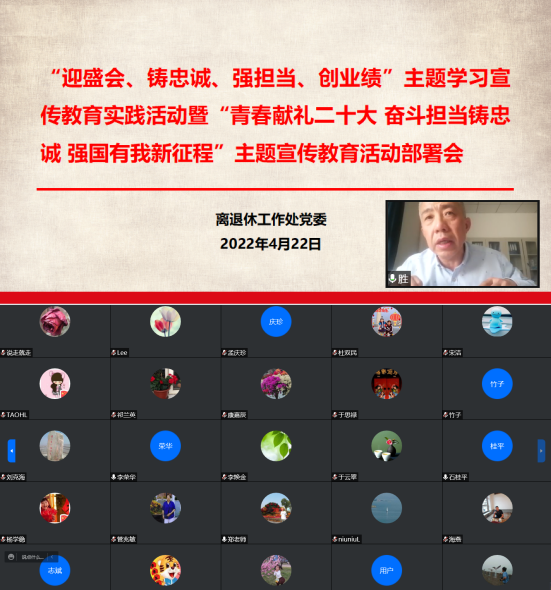 近日,离退休工作处党委通过腾讯会议组织召开“迎盛会、铸忠诚、强担当、创业绩”暨“青春献礼二十大 奋斗担当铸忠诚 强国有我新征程”两项主题活动部署会,会议由离退休工作处党委书记张健胜主持,全体在职同志、离退休党支部书记、委员、部分党员和老同志等40余人参会。
