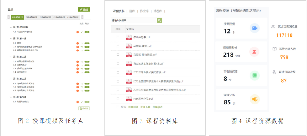 课前由教学团队精心录制好教学视频,并导入超星学习通《专业美术2》课程章节中,视频中教师对每堂课程学生需要掌握的知识点进行详细讲解,并布置好课后思考与练习。同时教学视频要求学生课前收看完成,教师通过超星学习通统计每位学生观看教学视频的进度,做到课前预习。目前本课程在学习通已上传课程组自制教学视频12个,总时长约218分钟,上传课程资料8项,覆盖全部教学重要知识点和重点难点问题,学生可反复观看学习,提高学习效率和知识目标达成率。