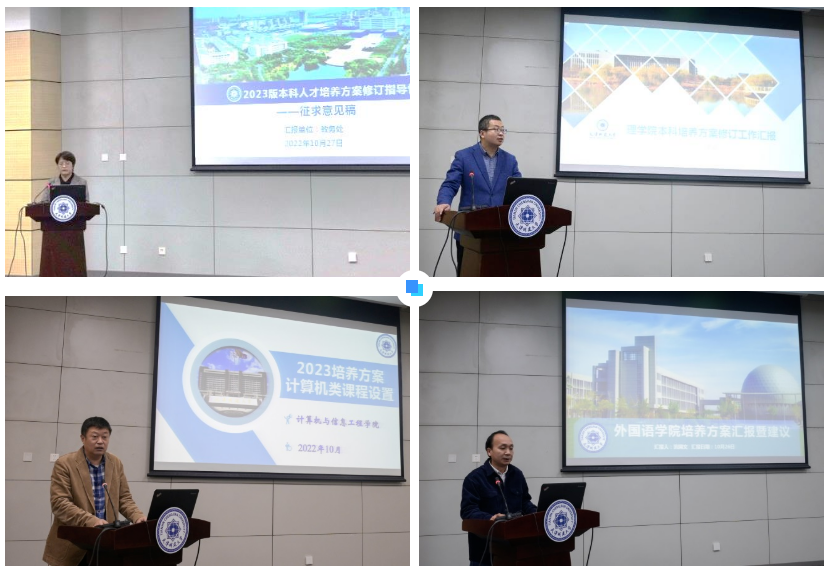 理学院副院长刘贵贤、计算机与信息工程学院副院长刘毅、外国语学院副院长范国文分别对数理化类、计算机类、外语类课程的设置情况进行汇报并提出意见建议。与会人员就2023版本科人才培养方案修订的指导性意见、学时学分设置、创新实践能力培养等方面展开深入讨论。