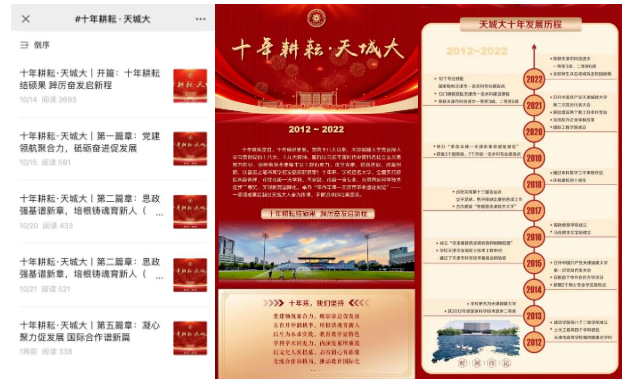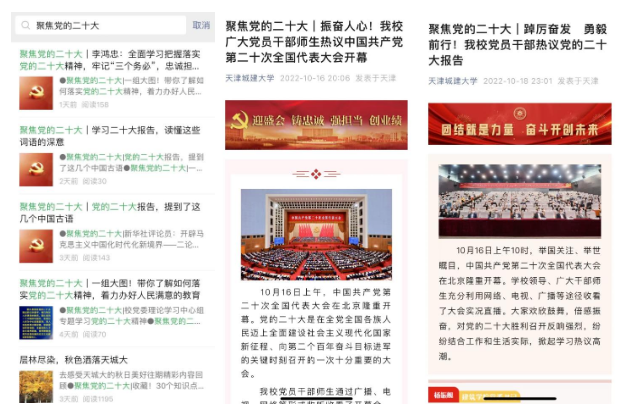 学校大力营造学习宣传贯彻党的二十大精神的浓厚氛围,学校微信公众号以及校院两级媒体精心设计,开设“喜迎二十大”“聚焦党的二十大”等栏目,引导全校师生党员干部全方位、多层次对党的二十大精神深入学习,进一步扩大党的二十大精神宣传广度,截止目前共发布相关新闻报道100条。其中,“振奋人心!bv伟德广大党员干部师生热议中国共产党第二十次全国代表大会开幕”“踔厉奋发 勇毅前行!bv伟德党员干部热议党的二十大报告”“马克思主义学院教师收听观看党的二十大开幕会掀起热烈反响”“鼓舞人心,催人奋进!bv伟德辅导员热议党的二十大”“青春逢盛会,奋斗正当时!bv伟德学生热议党的二十大开幕盛况”“党的二十大胜利闭幕,bv伟德师生热议闭幕会”等热议和反响情况,覆盖全校干部党员师生,使宣传效果迅速升温加力。开辟的“十年耕耘 天城大”特别报道,目前已围绕党建引领、铸魂育人、五育并举、师德师风、高教创新、国际交流与合作、教育扶贫、回顾展望等8个选题,分阶段、全面系统、重点突出地展示党的十八大以来学校发展取得的新业绩新成果。学校迎庆党的二十大相关新闻被人民网客户端、中国教育新闻网、天津日报、津云、津门教育等媒体报道13篇次,充分反映全校上下学习宣传贯彻党的二十大精神的实际行动和显著成效。