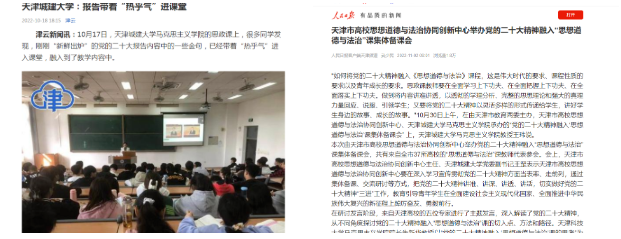 学校大力推进党的二十大精神第一时间进教材、进课堂、进头脑,将党的二十大精神的核心要义、丰富内涵和实践要求贯穿各门思政课程,进一步提升课堂教学的时代性、针对性、有效性。党的二十大开幕会结束,马克思主义学院第一时间组建党的二十大精神宣讲团,第一时间进行集体备课,让党的二十大精神带着“热乎气”进入课堂,融入到教学内容之中,从授课教师口中娓娓道来。 党的二十大精神还通过广大师生喜闻乐见的形式、丰富多彩的场景进行学习宣传贯彻。如,话剧《智取城防图》正在紧张排演,该剧生动展现天津解放的历史,激发学生爱国情怀,让学生看得懂、听得进、记得住。演讲比赛、辩论赛、团日活动等也有序开展。 “带你打卡天城大”活动正在如火如荼的开展,学生代表参观丰碑展、古琴弦歌基地、革命人物展,中国共产党全国代表大会图片展、党史教育展,科普基地等学校标志性场所,加深对党的二十大、党史、校史以及天城大校训精神的理解,增强学生爱党、爱国、爱校意识,引导学生做起而奋之的行动者,攻坚克难的奋斗者,追赶跨越的奋进者。
