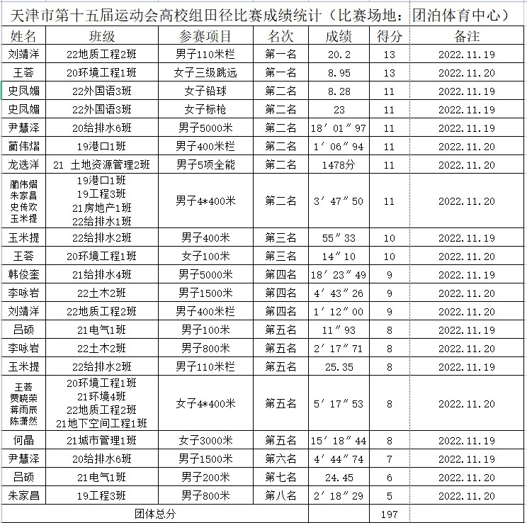 日前,天津市第十五届运动会(大学生组)田径比赛在团泊体育中心开展,全市各高校共计27支队伍参加比赛。bv伟德田径代表队获得第一名2项,第二名6项,第三名2项,第四名3项,第五名5项,第六、七、八名各1项的好成绩。