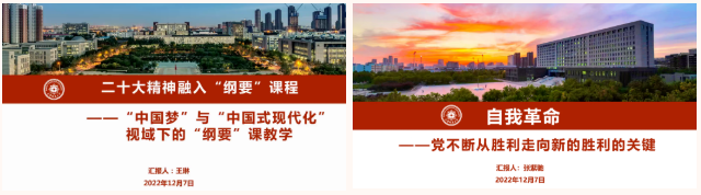 备课会上,思政课教师王琳以《“中国梦”与“中国式现代化”视域下的“纲要”课教学》为题,阐述了“中国梦”的形成以及“中国式现代化”道路的探索历程;思政课教师张紫驰以《自我革命——党不断从胜利走向新的胜利的关键》为题,围绕党的四个历史时期持续推进自我革命的生动实践,分享了将党的二十大精神融入“纲要”课的教学思考。