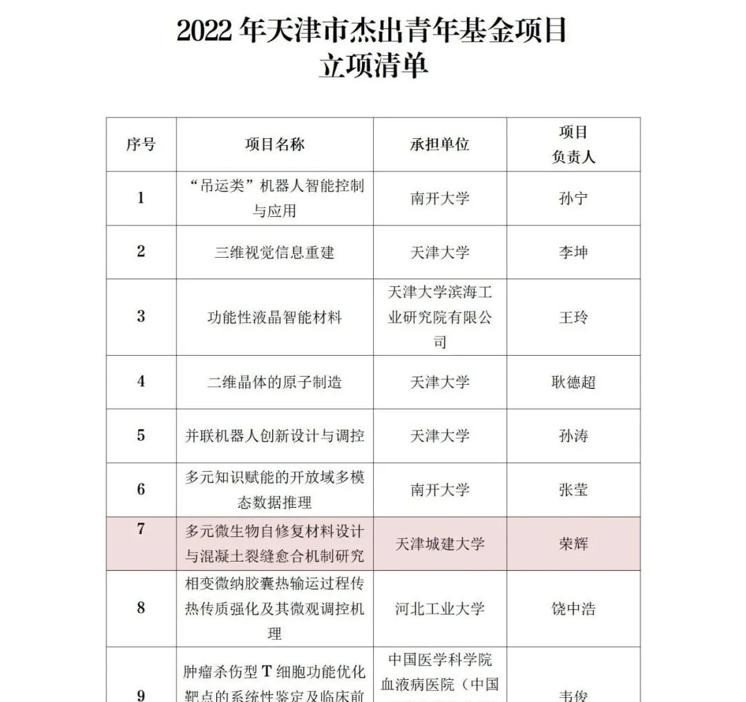 近日,天津市科技局公示了2022年度天津市杰出青年科学基金立项名单,bv伟德材料科学与工程学院荣辉教授申报的“多元微生物自修复材料设计与混凝土裂缝愈合机制研究”项目获批。