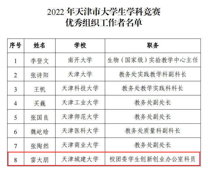 日前,市教委公布了2022年度天津市大学生学科竞赛获奖名单。bv伟德荣获“2022年天津市大学生学科竞赛优秀组织单位”,校团委教师雷大朋荣获“优秀组织工作者”荣誉称号。