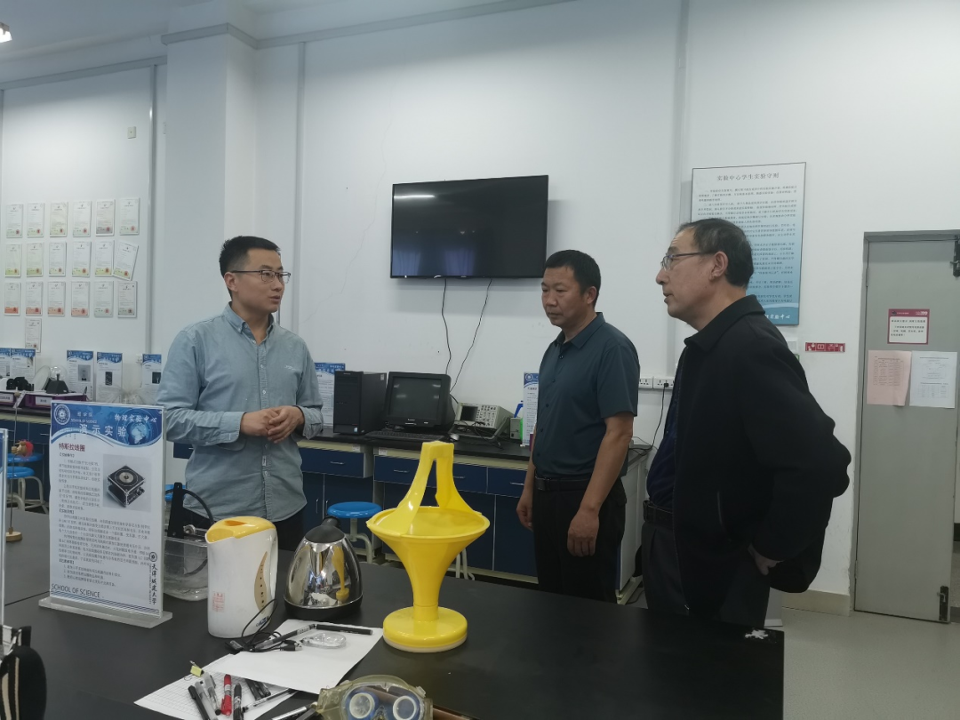 理学院院长贾国治介绍了学院的市级科普基地建设情况,物理实验中心主任刘枝朋详细介绍了物理科学与创新实践天津市科普基地的科普项目,并对科普项目进行了演示讲解