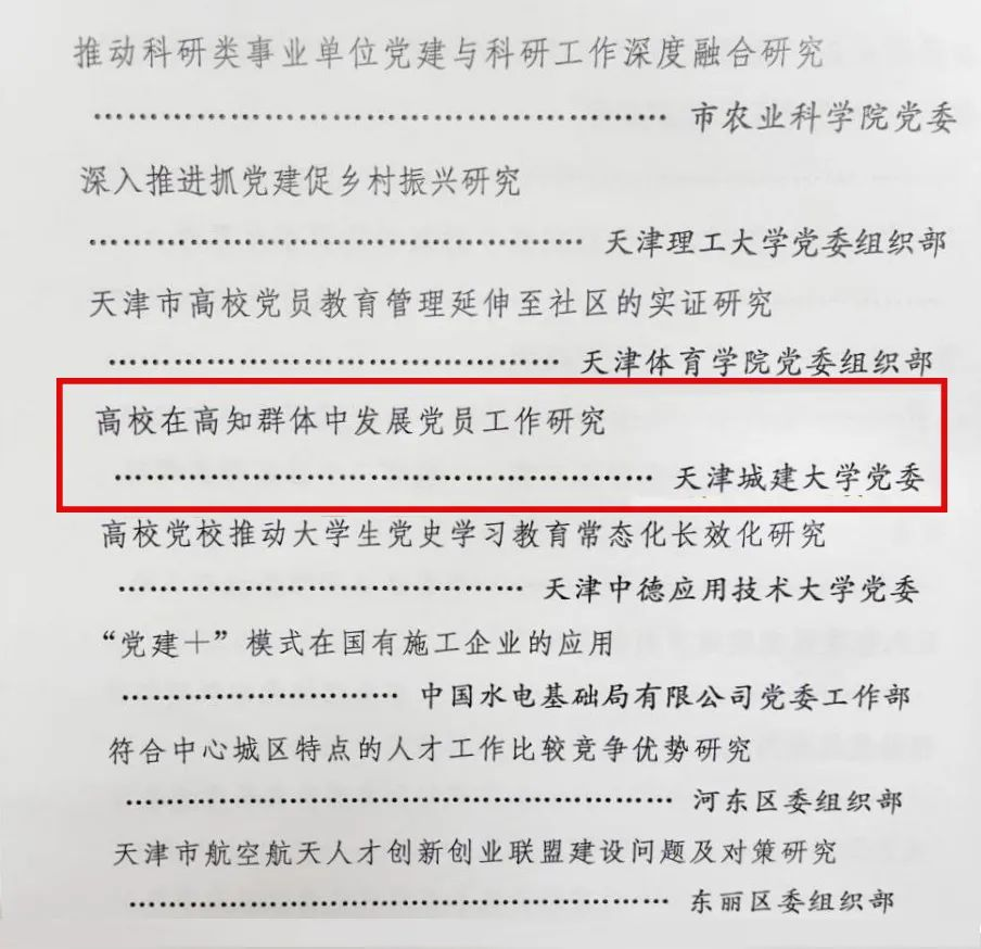 日前,天津市委组织部印发《关于表彰天津市2022年度组织工作获奖调研成果的通知》。bv伟德党委报送的调研成果《高校在高知群体中发展党员工作研究》,在全市相关部门报送的335篇调研成果中脱颖而出,荣获2022年度全市组织工作调研成果二等奖。