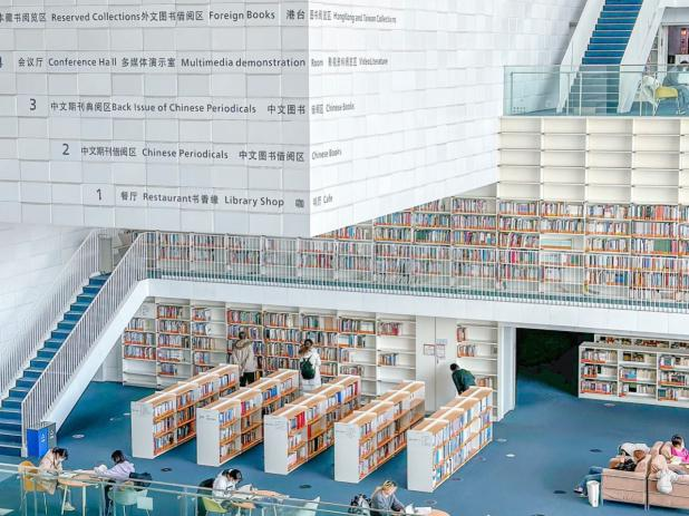 第四站,天津图书馆(文化中心馆)。天津图书馆的前身是始创于1908年的直隶图书馆。今天,天津图书馆已然发展成国家一级图书馆,格局上也变成了“一馆三舍”,即文化中心馆、复康路馆、海河教育园馆。文化中心馆的建筑设计立意为“智慧乐园”,强调图书馆是承载智慧的建筑。它分为地上五层,地下一层。建筑内部结合阅览功能设置了七个采光中庭。该建筑造型简洁、大气、现代,对防灾、节能、书本流线等技术问题均有独到的设计,是天津的地标网红图书馆。