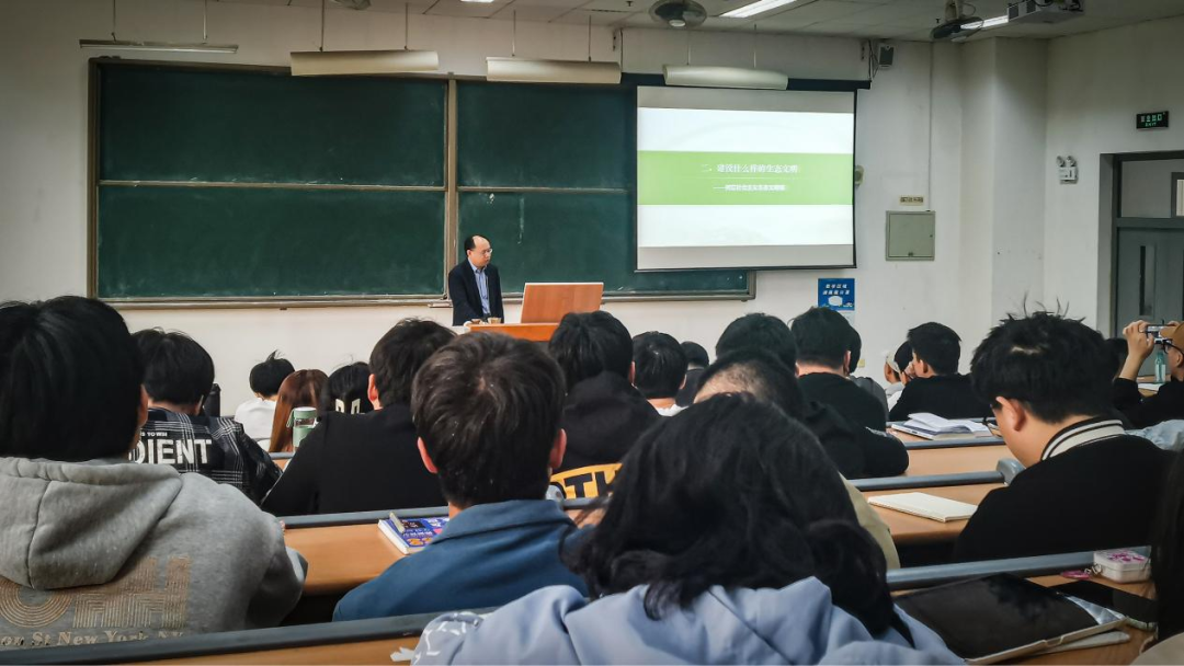 授课过程中,王中良抛出一连串的问题,与同学们面对面掀起“头脑风暴”。通过勾勒人类文明的发展历程,从顺应人类文明进程、破解我国经济社会发展短板问题、满足人民日益增长的优美生态环境需要、应对全球生态环境领域挑战等方面阐述生态文明建设的必要性和紧迫性;进而深入浅出地剖析人与自然和谐共生的要求、绿水青山与金山银山的辩证关系、良好生态环境是最普惠的民生福祉、用最严格制度最严密法治保护生态环境等内容阐明我们要建设什么样的生态文明,要树立什么样的社会主义生态文明观;最后鼓励青年学子要做生态文明建设的宣传者、倡导者、践行者,为建设美丽天津、美丽中国贡献青春力量。
