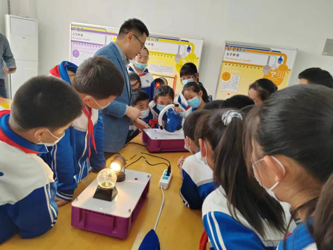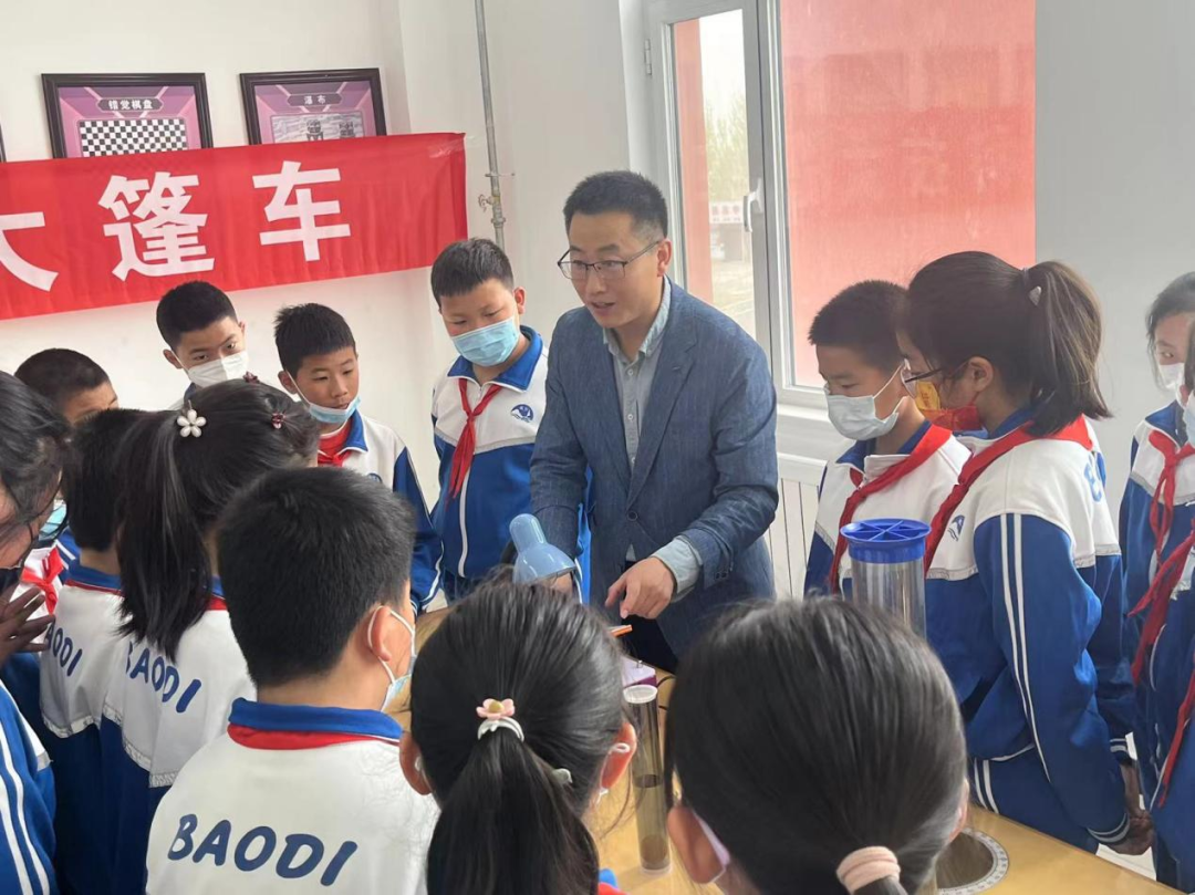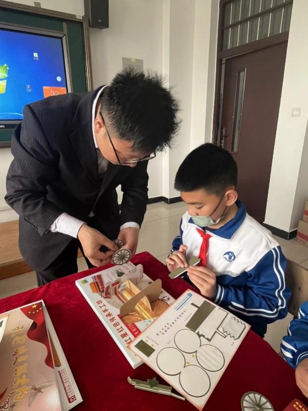 理学院为同学们带来神奇饮水鸟、鱼洗、光压风车、时光隧道等科普演示仪器10余套,刘枝朋老师进行了生动地讲解与演示,带领同学们进行了“穿墙而过”实验的动手制作,为同学们带来了一场内容丰富的科普体验,激发同学们积极思考物理知识、探寻内在原理,并向王卜庄小学赠送“穿墙而过”科普器材50套,用于支持活动站的科普活动开展。