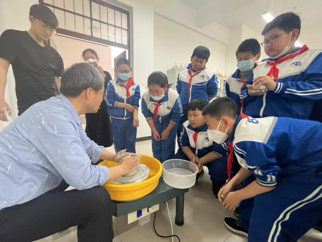 李计元以展板的形式向同学们开展了陶瓷基础知识普及,用实物讲解了陶瓷器具,带领同学们现场体验了陶瓷拉坯、成型与制作,并向王卜庄小学赠送精心制作的陶瓷制品10余件,用于支持活动站的运行。