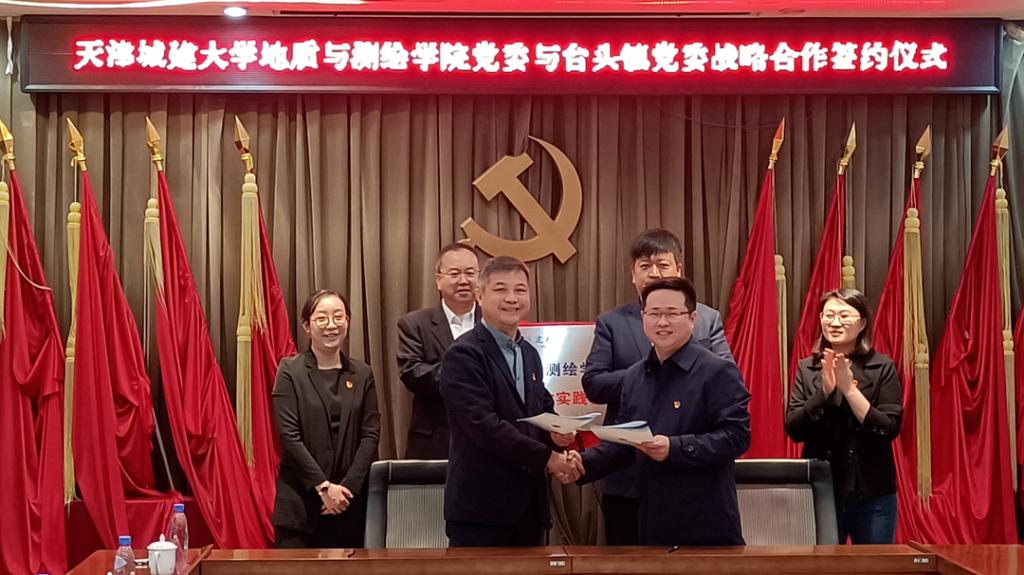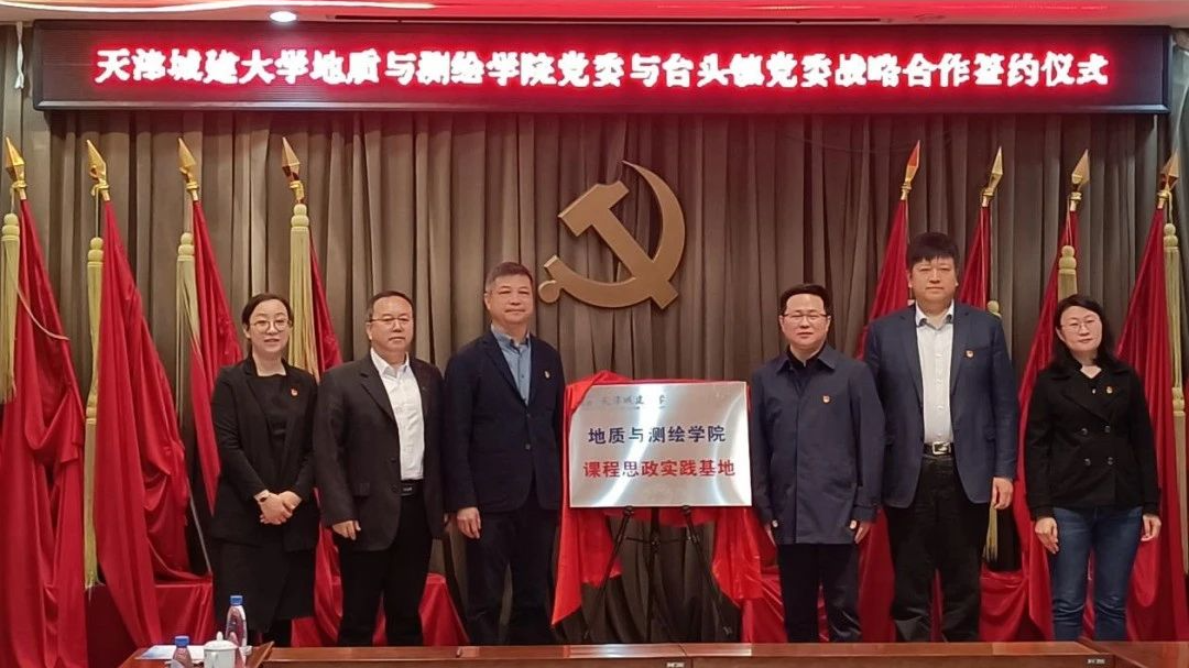 4月27日,地质与测绘学院党委与天津市静海区台头镇党委战略合作协议签署仪式暨课程思政实践基地揭牌仪式在台头镇政府举行,台头镇党委书记蒋峣,党委副书记、镇长岳友岭,党委副书记辛长艳和bv伟德国际1946地质与测绘学院党委书记尚军,院长汪东川,党委副书记白静及有关同志出席签约仪式。