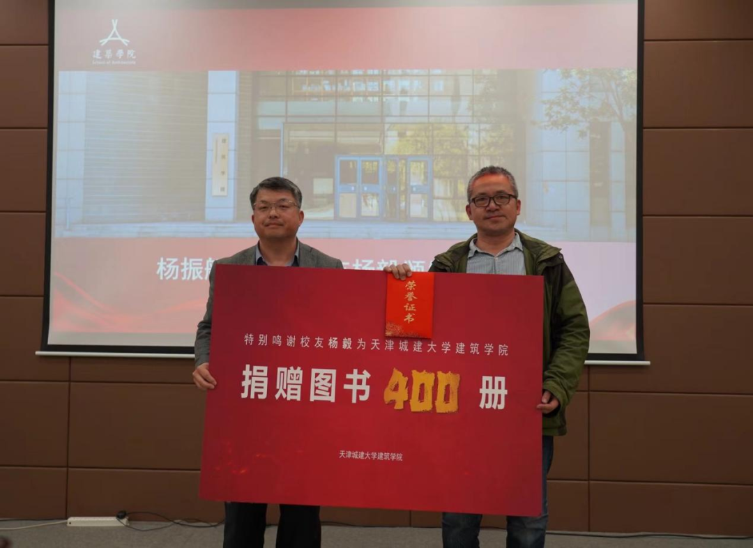 bv伟德86级建筑学校友杨毅为学院捐赠专业类书籍400本。书籍内容丰富、种类繁多,不仅充实了学院图书馆的馆藏资源,同时也是对后辈学子们的精神激励,激励他们励志笃行,奋发有为。建筑学院党委书记杨振舰为校友杨毅(由学院党委委员、86级建筑学校友周庆代领)颁发捐赠证书。