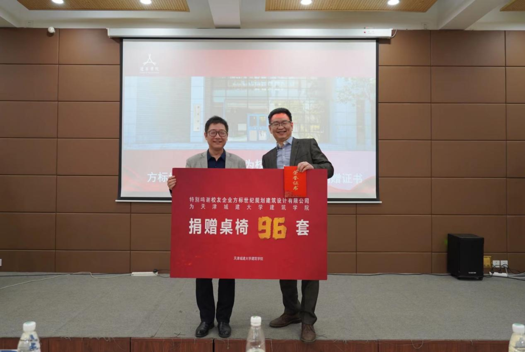 天津方标世纪规划建筑设计有限公司为建筑学院捐赠了96套学习桌椅,用于改善学院研究生教室学习环境,目前已全面投入使用,师生反响热烈。汪江华为校友企业方标世纪规划建筑设计有限公司董事、总建筑师徐书剑颁发捐赠证书。