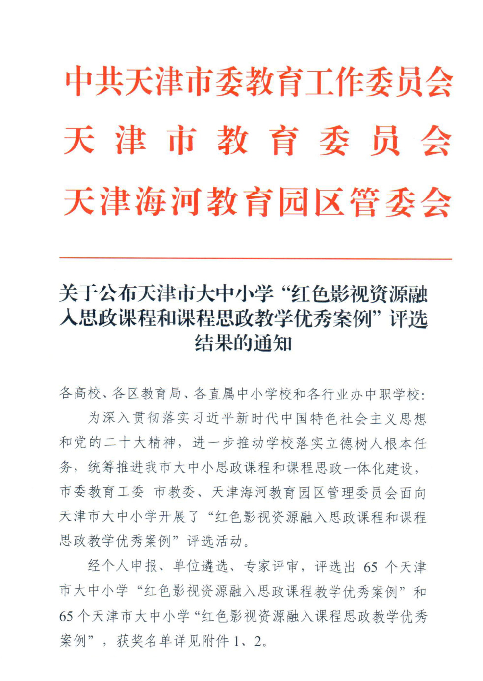 近日,天津市委教育工委、市教委、天津海河教育园区管理委公布2022年天津市大中小学“红色影视资源融入思政课程和课程思政教学优秀案例”评选结果,bv伟德获评思政课程教学优秀案例、课程思政教学优秀案例各1项。
