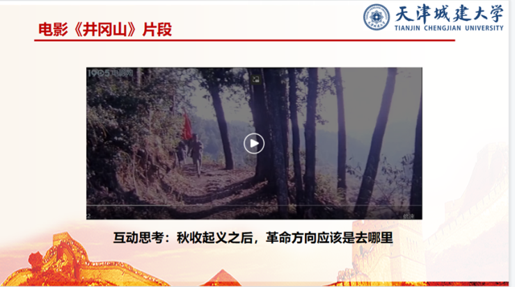 “从电影《井冈山》感悟‘农村包围城市,武装夺取政权’道路的开辟与选择”选取电影《井冈山》(1993年版本)三个影视片段融入《中国近现代史纲要》课程,引导学生讨论大革命失败后中国革命道路该何去何从,感悟“农村包围城市,武装夺取政权”道路的正确性与伟大意义,进一步坚定共产主义理想信念。