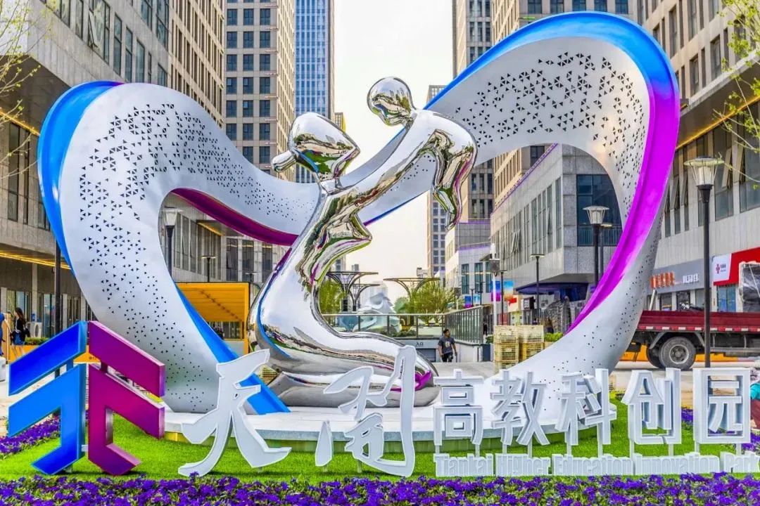 5月14日,天开高教科创园主雕塑在核心先导区——天津科技广场南广场树立完成,莫比乌斯环围合“母育子”的形象寓意“天开”的未来拥有无限可能。