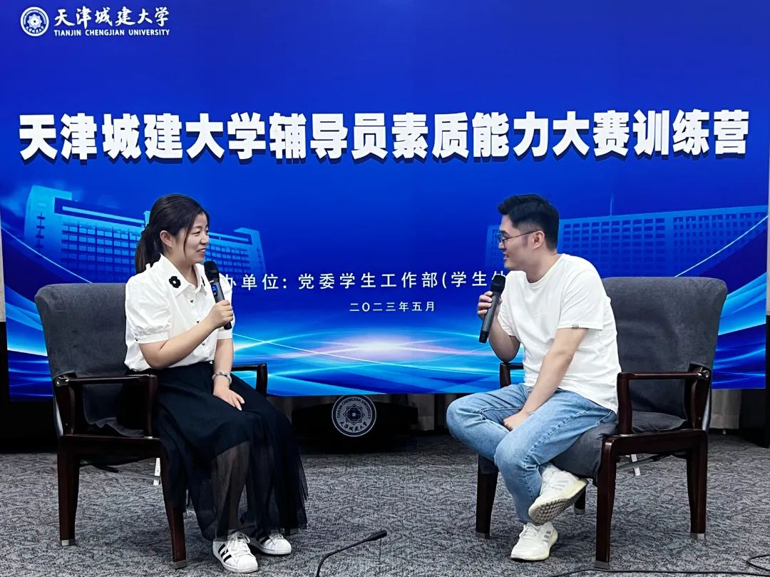 训练营通过现场实景模拟与典型经验分享相结合的方式进行。天津市优秀辅导员、土木工程学院团委书记付马和学校首届辅导员素质能力大赛一等奖获得者、国际教育学院辅导员姜丽晶现场模拟大赛案例研讨环节,采用AB角形式,以“你提问,我回答”的方式,围绕案例共同辨析原因、研讨对策、总结规律。模拟展示结束后,付马和姜丽晶分别对案例研讨备赛的关键点进行了总结和阐释,表示在案例研讨中选手们既是竞争者、也是合作者,既要出招、也要接招,要争取通过高质量的提问回答,全方位展现自己的理论知识储备和解决实际问题的能力。