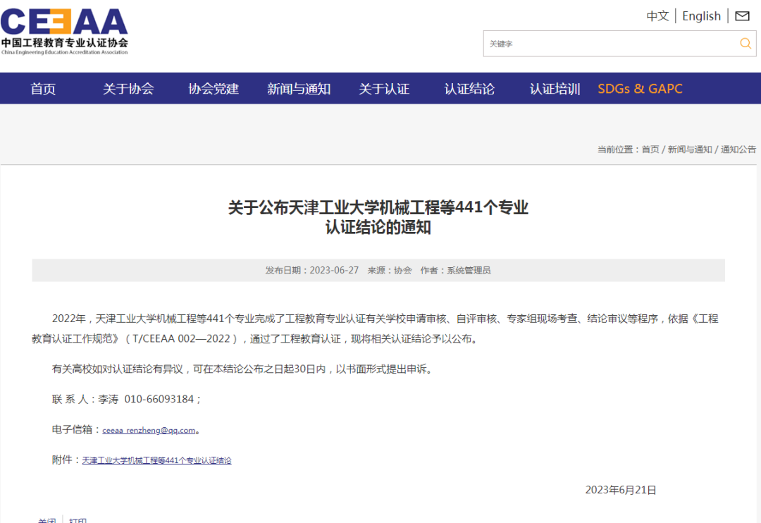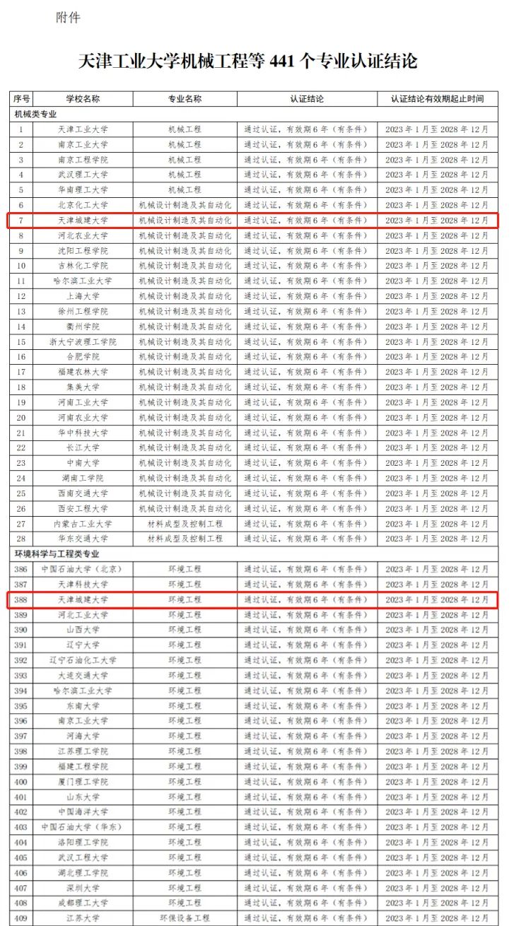 日前,中国工程教育专业认证协会官网发布《关于公布天津工业大学机械工程等441个专业认证结论的通知》,bv伟德机械设计制造及其自动化专业、环境工程专业通过了工程教育认证,有效期为六年(有条件),认证结论有效期起止时间为2023年1月至2028年12月。