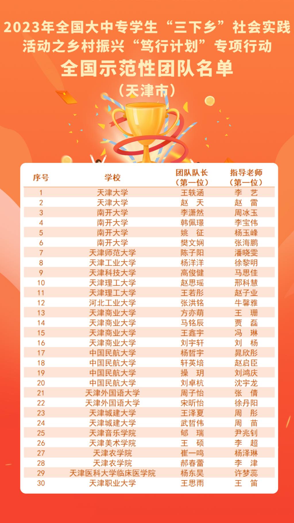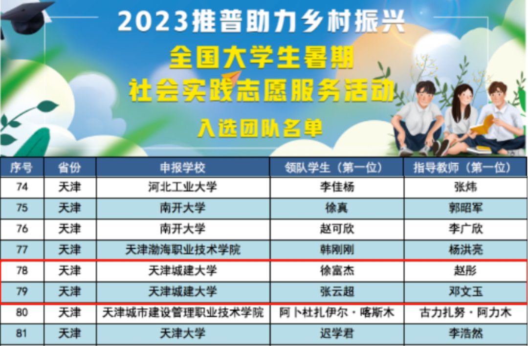 近日,教育部、团中央分别公布了2023年“推普助力乡村振兴”全国大学生暑期社会实践志愿服务活动入选团队名单、2023年全国大中专学生“三下乡”社会实践活动之乡村振兴“笃行计划”专项行动全国示范性团队名单(天津市),经过实践团队自主申报、学校推荐,最终bv伟德2支实践团队入选2023年“推普助力乡村振兴”全国大学生暑期社会实践志愿服务活动,2支实践团队入选2023年全国大中专学生“三下乡”社会实践活动之乡村振兴“笃行计划”专项行动。