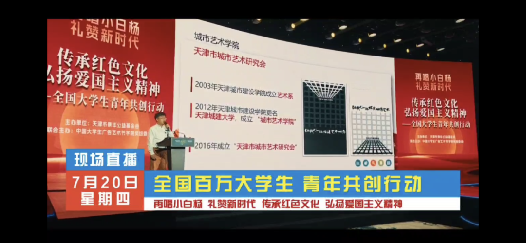 7月20日,由景华公益基金会与中国大学生广告艺术节“学院奖”组委会共同发起的《再唱小白杨,礼赞新时代》——中国大学生红色主题的年度大型公益项目在北京电视台举行发布会,共同面向1800多所高校、5000多个学院150多万学生发起《传承红色文化,弘扬爱国主义精神》全国大学生青年共创行动。