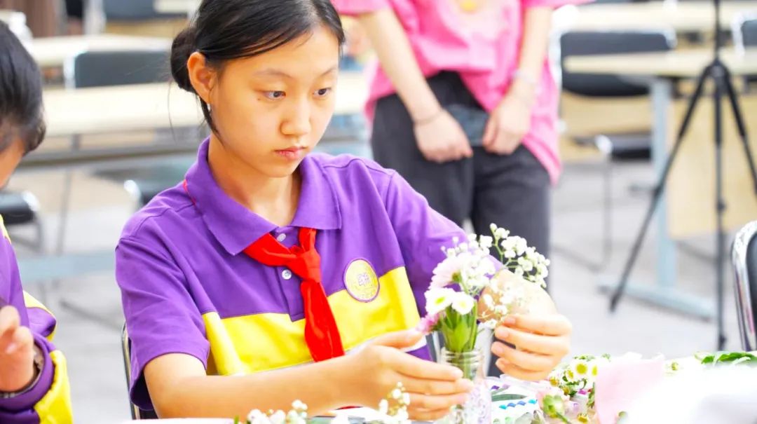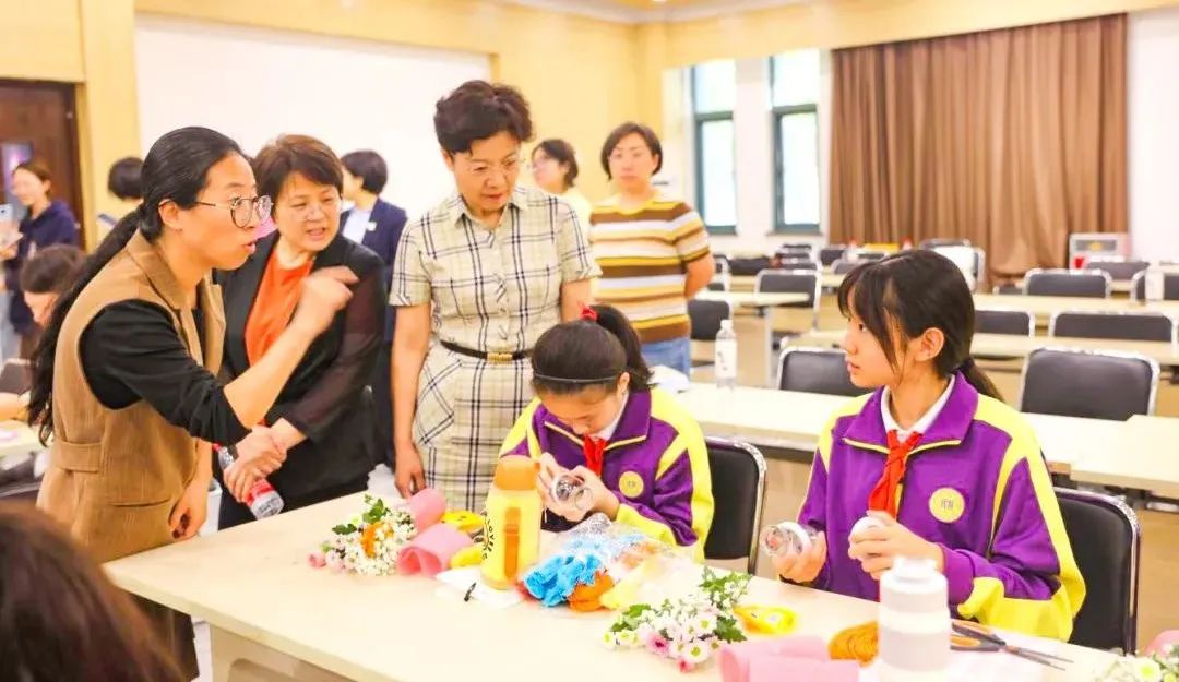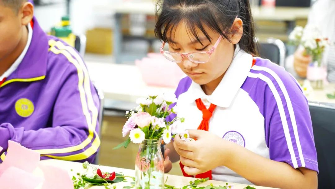 “老师,我在废弃的奶瓶上画上了紫色的花纹,我喜欢紫色的花朵,搭配一下可以吗?”“可以的,你还可以选择紫色的缎带进行装饰,再选择一些素色的花朵进行搭配,这样主花宾花有所区分更漂亮。”在“迷人的垃圾——变废为宝插花课”上,bv伟德国际1946建筑学院的许老师亲切地回答着每一位中学生所提出的每一个问题。