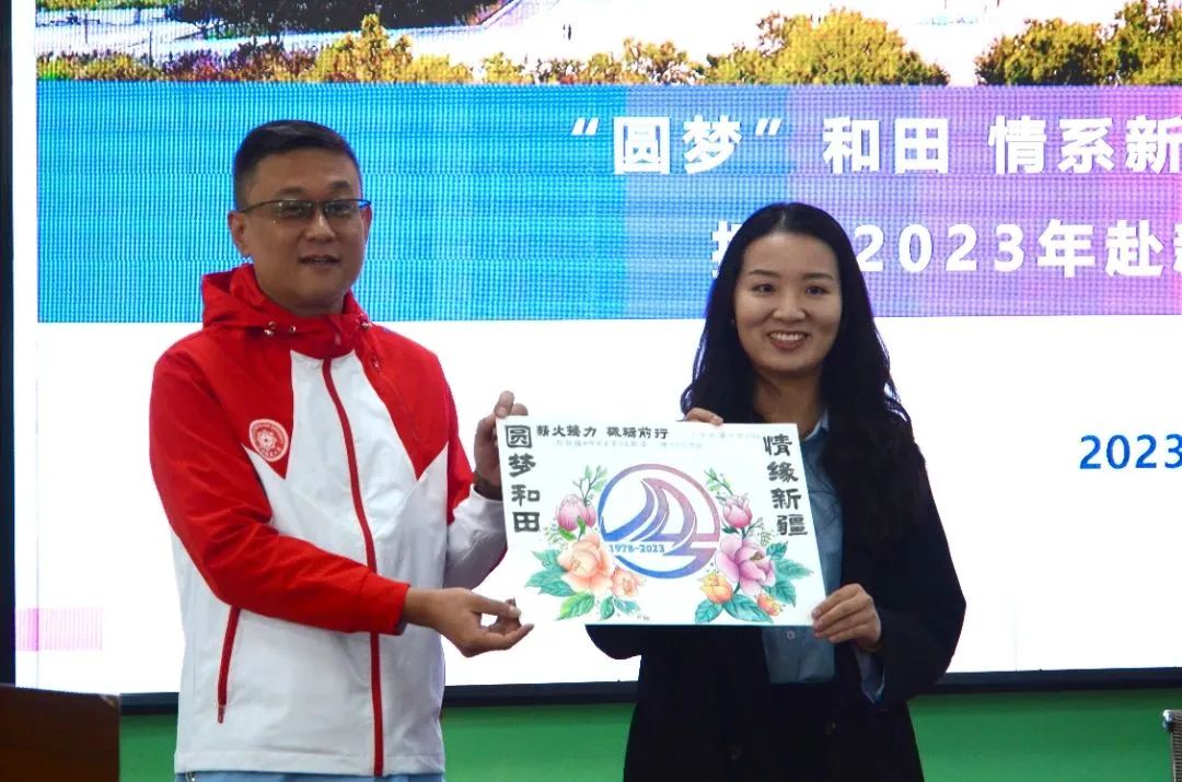 见面会后,支教团领队陈磊代表bv伟德国际1946赴新疆和田地区实习支教团向唐超学长送上祝福和礼物。