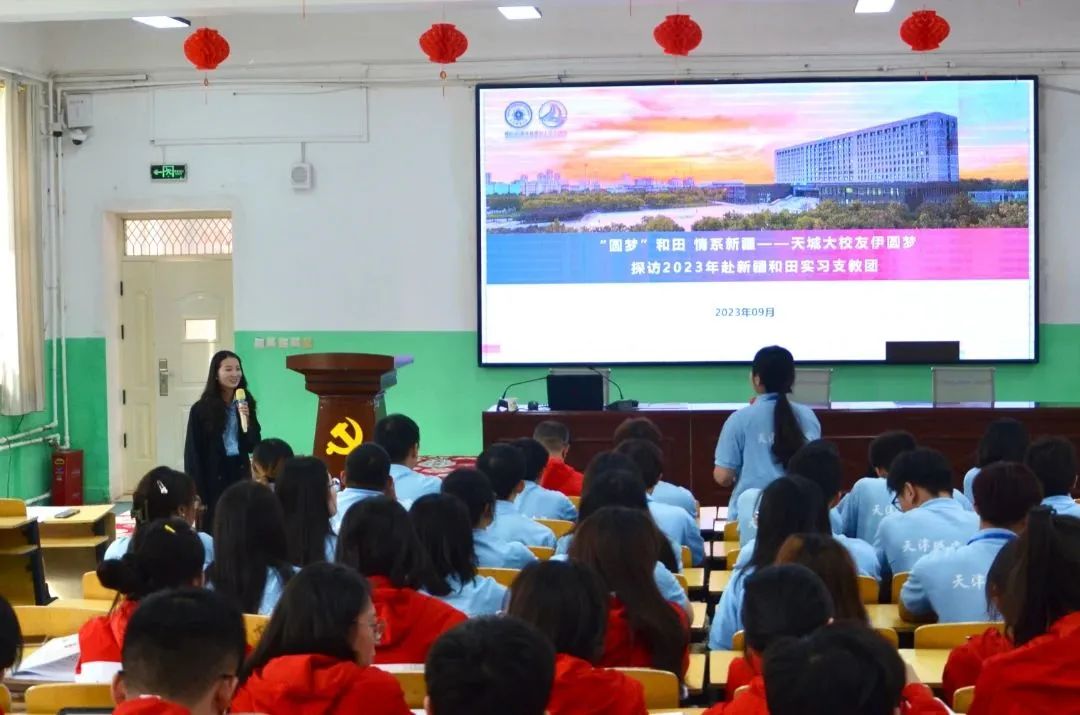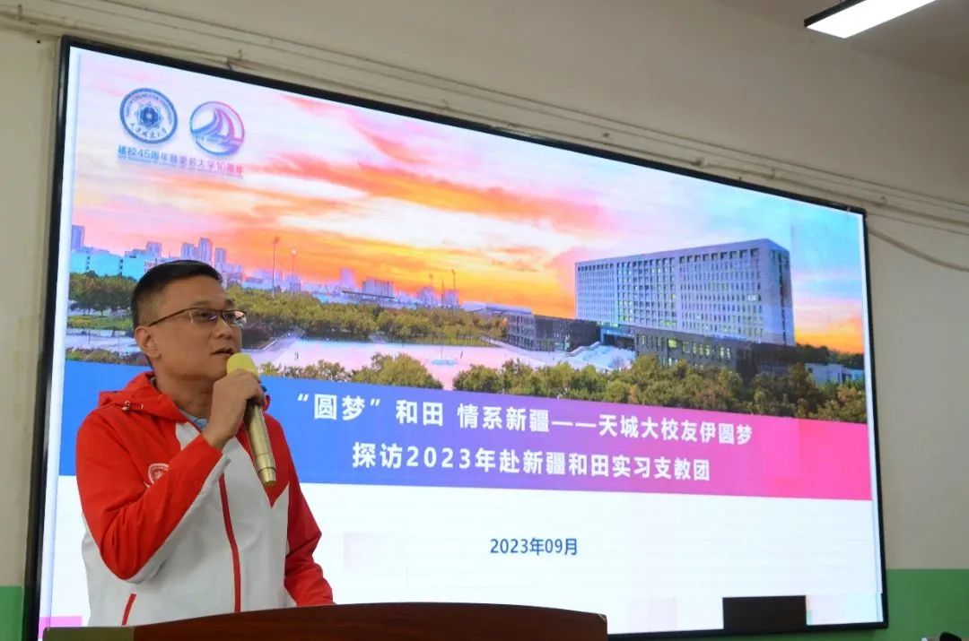 今年9 月,得知bv伟德国际1946 2023 年赴新疆和田地区实习支教团来到于田县,伊圆梦在第一时间联系支教团并约定在校庆之际进行探访慰问,开展了一场名为“‘圆梦’和田 情系新疆”的见面会。会上,她从“为什么选择来”和“为什么坚持在”两个方面展开,她表示,“选择来”是一种情怀,而“坚持在”是责任与担当。