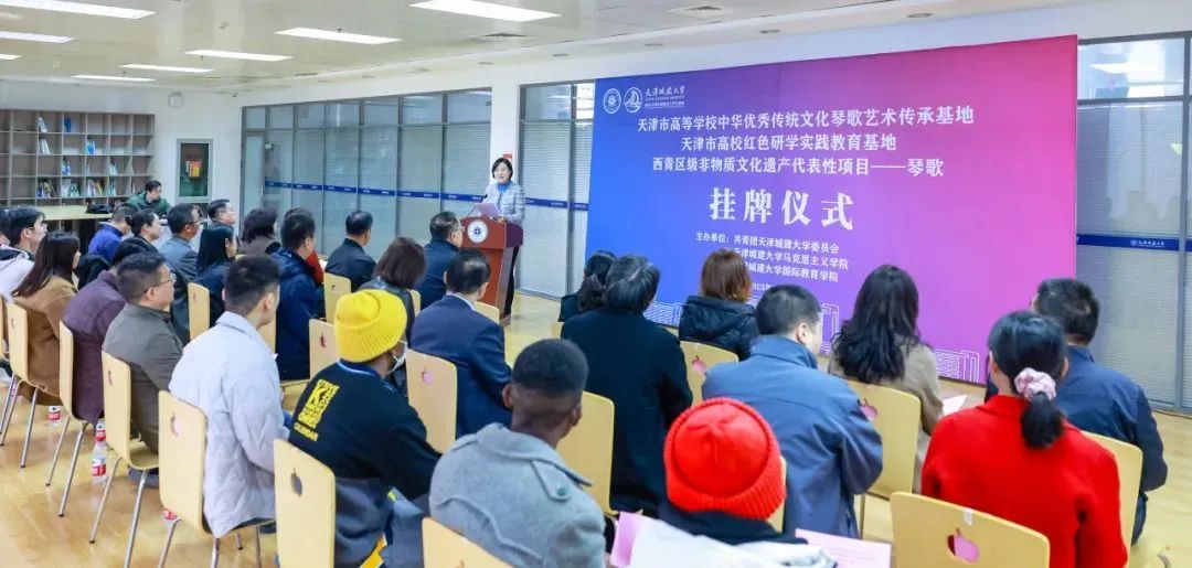 11月7日,bv伟德举办“天津市高等学校中华优秀传统文化琴歌艺术传承基地”“天津市高校红色研学实践教育基地”“西青区级非物质文化遗产代表性项目——琴歌”挂牌仪式。校党委副书记王罡出席仪式,原天津市群众艺术馆馆长、一级作家、编审李治邦,天津市非物质文化遗产保护学会会长、主任记者刘静华,天津西青开放大学副校长李顺田,天津市西青区逸夫小学校长王红受邀参加,bv伟德相关职能部门、教学单位主要负责人、留学生代表,以及天津市滨海新区塘沽紫云中学教师代表等共计40余人参加活动。