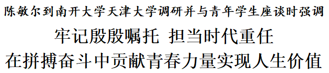 陈敏尔说,青年是祖国的未来、民族的希望。希望同学们热爱就学的城市,了解天津、扎根天津、立业天津,将个人的理想融入到天津的发展之中,在天津逐梦未来,与天津共同成长,用专业所学和拼搏奉献把天津建设得更加美好。热爱奋斗的事业,牢记奋斗是青春最亮丽的底色,激荡敢为人先、敢于突破的胆识,笃定锲而不舍、自强不息的精神,奋发进取,用心做事,不断开辟事业发展新天地,实现自己的人生价值。热爱健康的生活,树立正确的世界观、人生观、价值观,弘扬中华民族传统美德,培养积极健康的生活方式和兴趣爱好,追求更有高度、更有境界、更有品位的人生。市委、市政府将一如既往地关心关注青年成长,为大家在这里学习生活、就业创业创造良好条件,营造“近悦远来”的人才生态,努力使天津成为青年人才的向往之地、聚集之地。