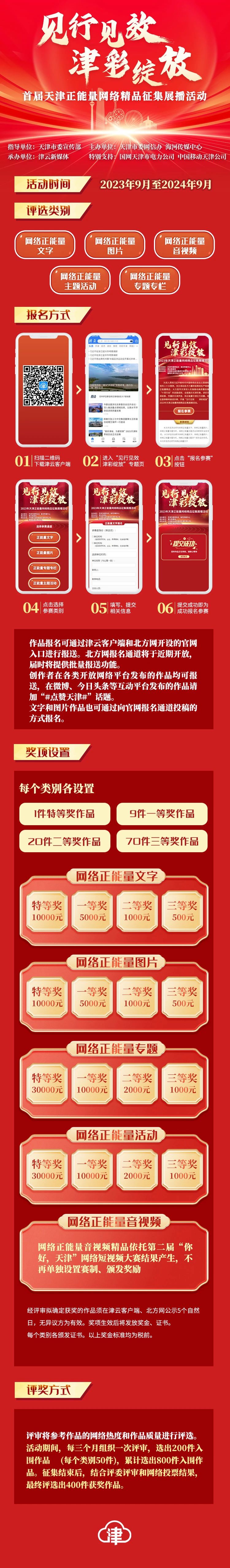 首届天津正能量网络精品征集展播活动以“见行见效 津彩绽放”为主题,面向各区、各部门、各网络媒体、各高校、各社会组织广泛征集网络正能量文字、图片、主题活动、专题专栏,同时依托第二届“你好,天津”网络短视频大赛征集音视频作品。2023年9月至2024年9月为作品征集阶段,同步择优展播;2024年10月,举办活动总结(颁奖)会议,之后集中展播。活动启动至2023年12月,征集2023年1月1日至12月31日发布的涉津网络正能量作品;2024年1月1日至9月30日,征集期间发布的涉津网络正能量作品。作品报名可通过津云客户端和北方网开设的官网入口进行报送(北方网报名通道将于近期开放,届时将提供批量报送功能)。创作者在各类开放网络平台发布的作品均可报送,在微博、今日头条等互动平台发布的作品请加“#点赞天津#”话题。文字和图片作品也可通过向官网报名通道投稿的方式报名,审核通过后发布展示在津云客户端,即获得参评资格。活动期间,每三个月组织一次评审,选出200件入围作品(每个类别50件),累计选出800件入围作品。征集结束后,结合评委评审和网络投票结果,最终评选出400件获奖作品。作品评选将重点参考网络热度和质量,获奖作品将获得丰厚奖金,在全网展播,并优先推荐参评中国正能量网络精品。