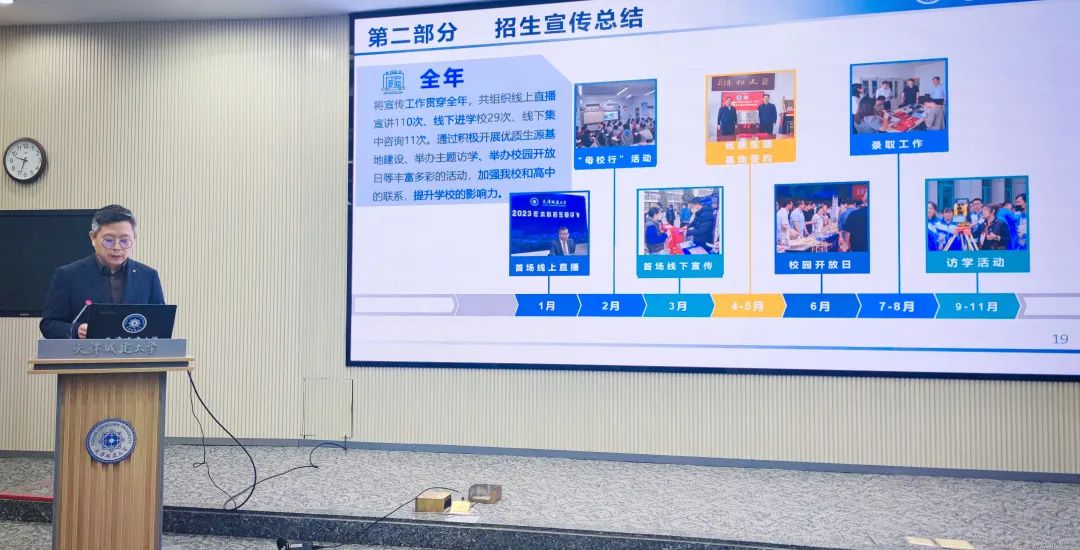 会上,教务处(招生办公室)副主任陈烜从录取数据分析、招生宣传总结和来年工作重点三个方面进行了2023年度招生工作总结汇报。通过对录取数据的多角度分析、介绍了bv伟德在全国33个省、市、自治区的录取位次变化情况和bv伟德在津招生的录取情况;以服务考生及家长为初心、以提高bv伟德生源质量为目标,学校精心设计了全年的招生宣传工作内容,突出多角色参与、多形式交叉,以“全年、全员、全渠道”的招生宣传模式为抓手,顺利完成了招生宣传的每一项工作;根据本年度招生宣传工作的经验及学生群体的调研反馈,对来年招生宣传工作进行了重点谋划。