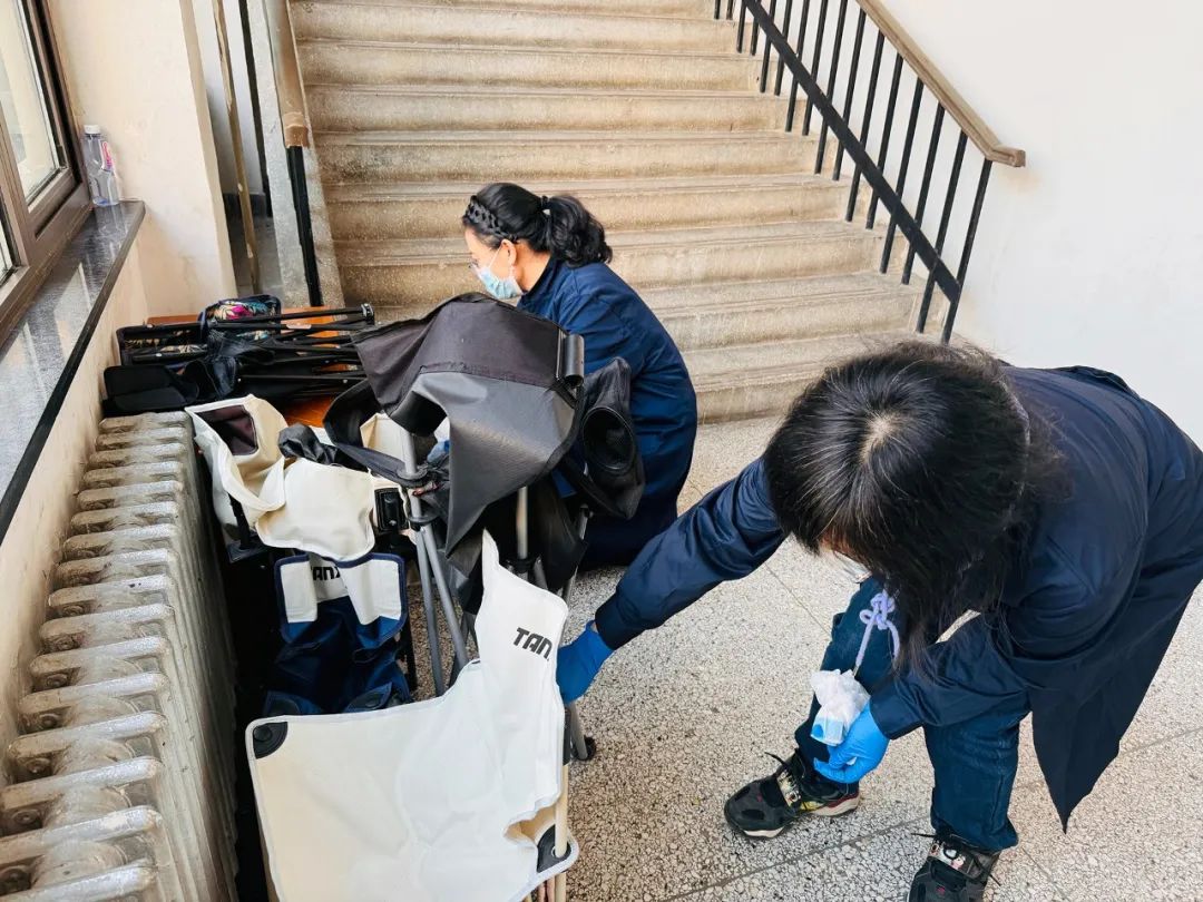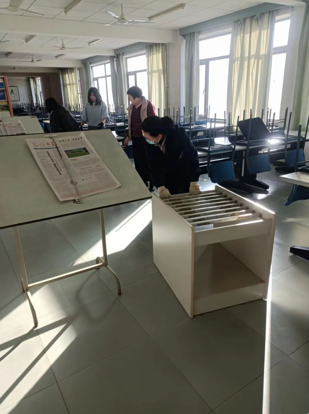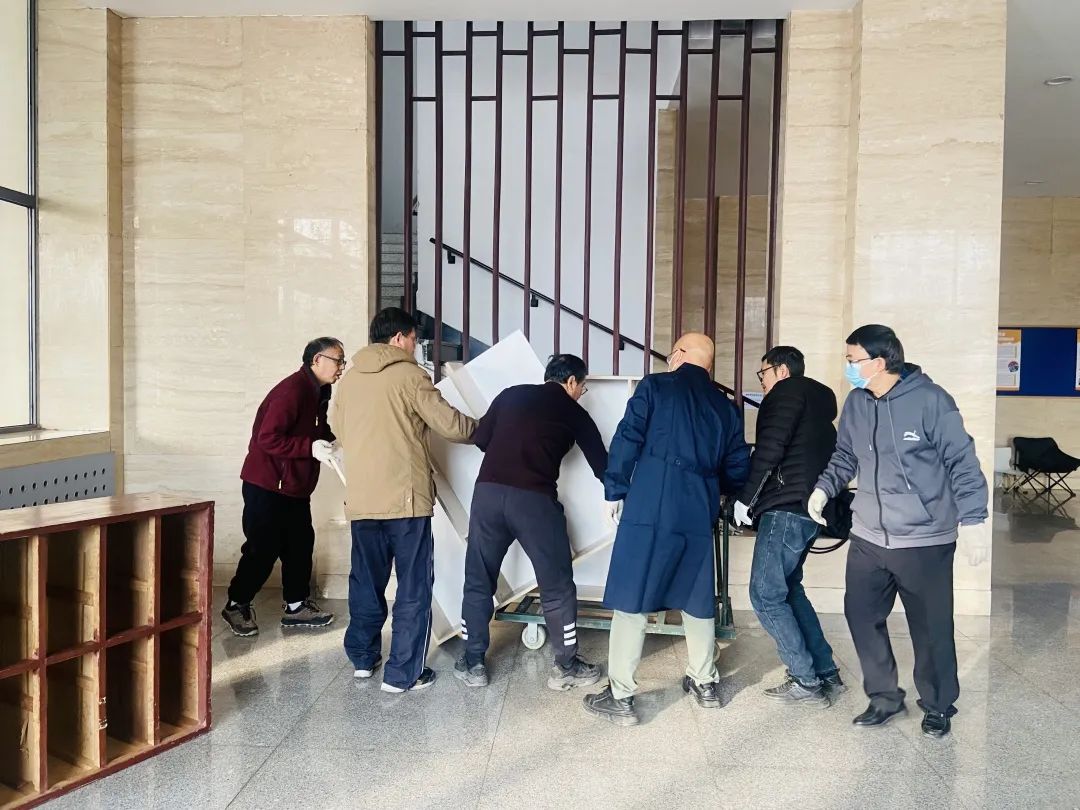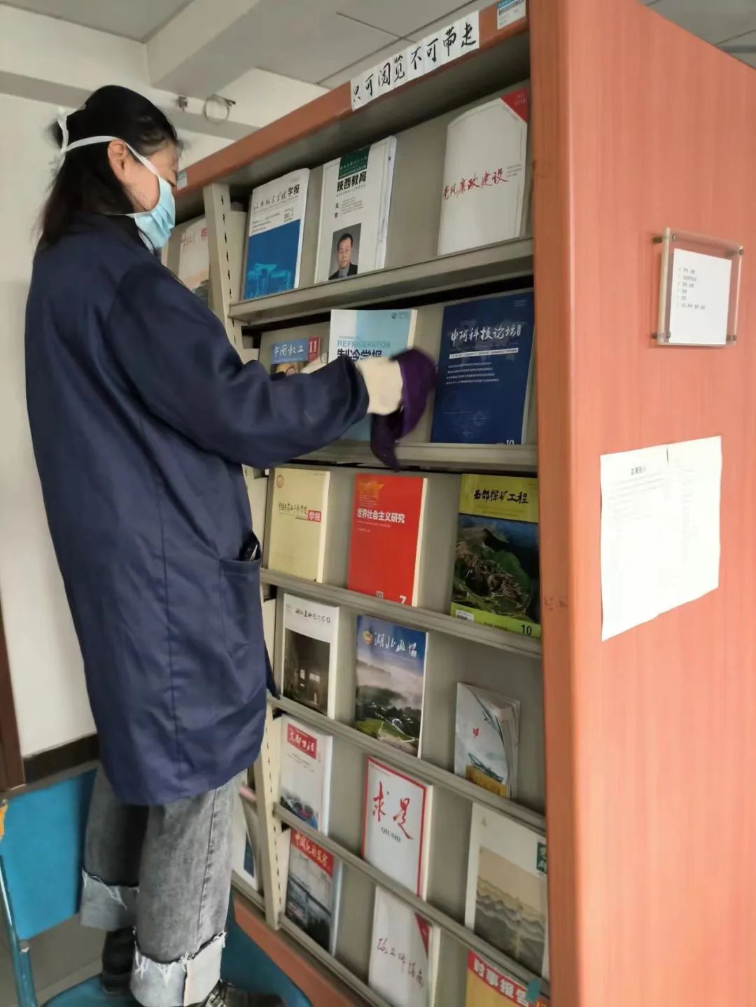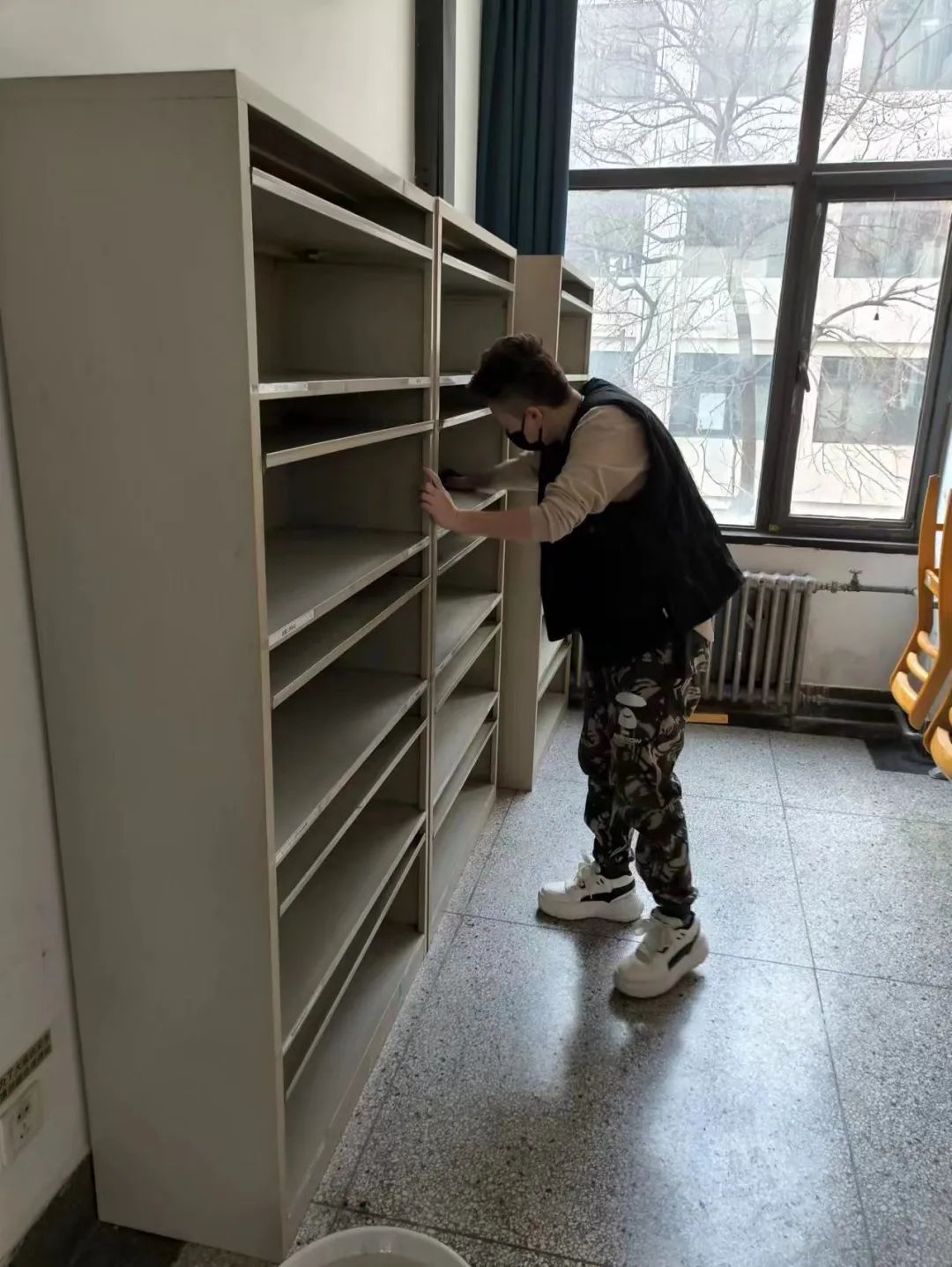 书格架找到了,如何能顺利安全摆放到位满足使用呢?连日来,馆内每天一早就将当天的任务安排发布到工作群,大家就自觉主动认领任务积极工作。全馆男教职工几人一组,手搬肩扛、抬运车拉安全顺利完成了40余组书格书架和70余个条桌的拆卸、组装和固定安置工作,对个别尺寸较大的男教工们就手把手接力一个台阶一个台阶地从一层楼爬到高一层楼。全馆女教工也不甘示弱,按照部门分成三组纷纷拎起水桶端起水盆拿起抹布打上热水对所有书格书架、个别房间电线网线及环境卫生进行清理保洁。尽管每天大家的劳动工作内容随着“战场”调整都会变化,但团结干事的热情和为同学们创造更好学习条件的师者仁心没有丝毫变化。