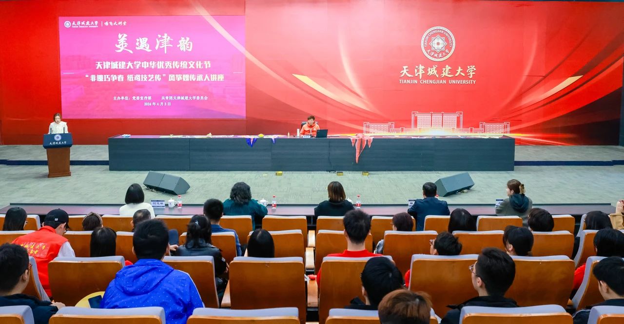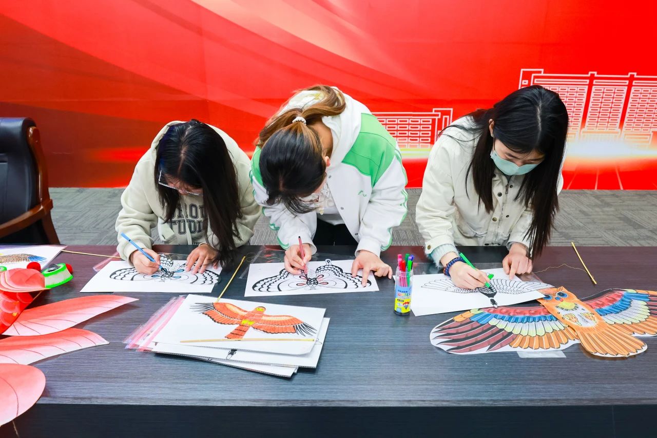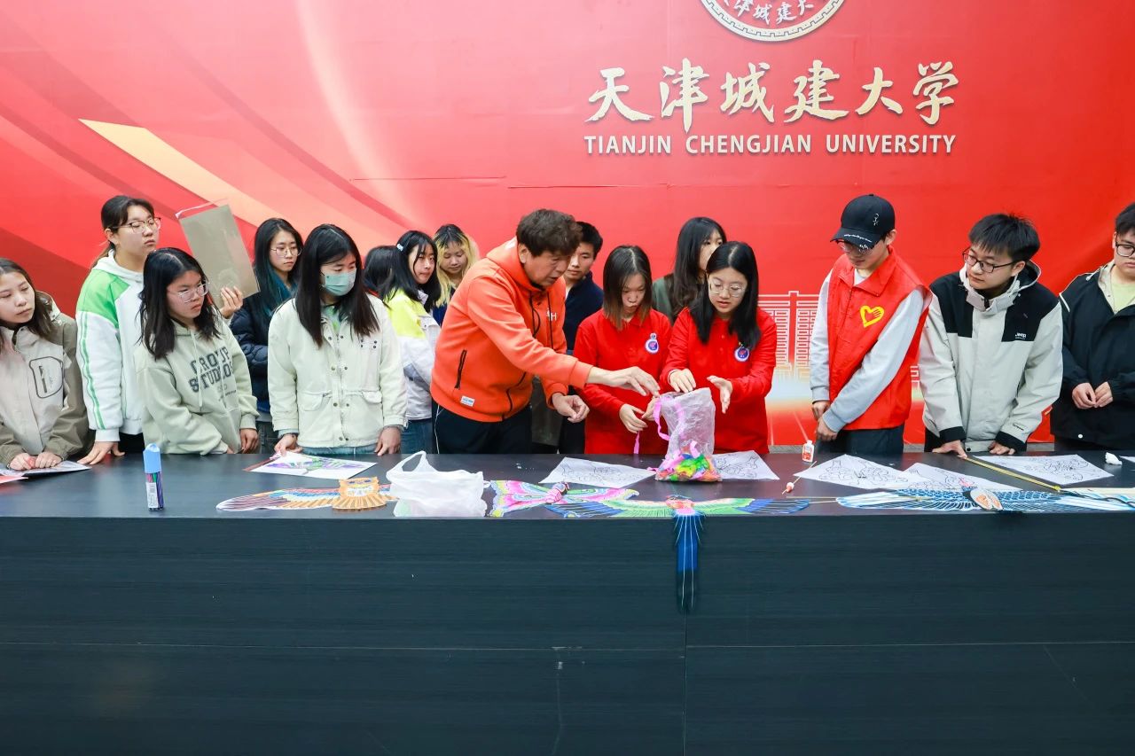 魏国秋详细回顾了“风筝魏”的历史发展脉络与历代创作大师的典型作品,剖析了“扎、糊、绘、放”风筝制作工艺的四大要点。并通过现场互动的方式,带领在场师生绘画、制作和放飞“太极风筝”。一个个颜色各异的风筝在报告厅上空盘旋,在场师生亲身体验“风筝魏”独特的艺术个性和复杂的制作工艺,更加深入的了解了天津本土文化的独特内涵,感受中华优秀传统文化的博大精深。
