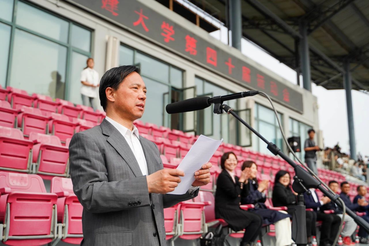 庄严的升旗仪式结束后,校党委常委、副校长陈志华致开幕词,代表学校向运动会的召开表示热烈的祝贺,向全体裁判员、运动员和工作人员致以亲切的问候和崇高的敬意。他表示,体育强则中国强,国运兴则体育兴。党的二十大提出“广泛开展全民健身活动,加强青少年体育工作,促进群众体育和竞技体育全面发展,加快建设体育强国。”学校全面贯彻党的教育方针,落实立德树人根本任务,将体育融入为党育人、为国育才全过程,实施“城大行动”,积极推进“五育融合”,着力打造“五育并举”品牌,广泛开展普及性体育活动,取得了丰硕的成果。希望全体运动员要充分发扬“更高、更快、更强”的体育精神,在赛场上磨砺顽强意志,在跑道上书写追风传奇,在拼搏中绽放活力风采;全体裁判员要秉公执裁,热情服务,无私奉献,优质高效地完成各项裁判工作;全体师生要乘运动之帆、扬拼搏之志、聚磅礴之力,将赛场上的声声呐喊转化为奋力拼搏的无穷能量。