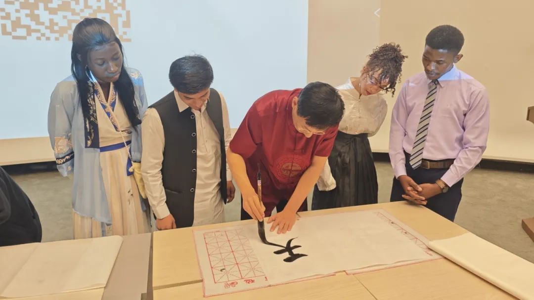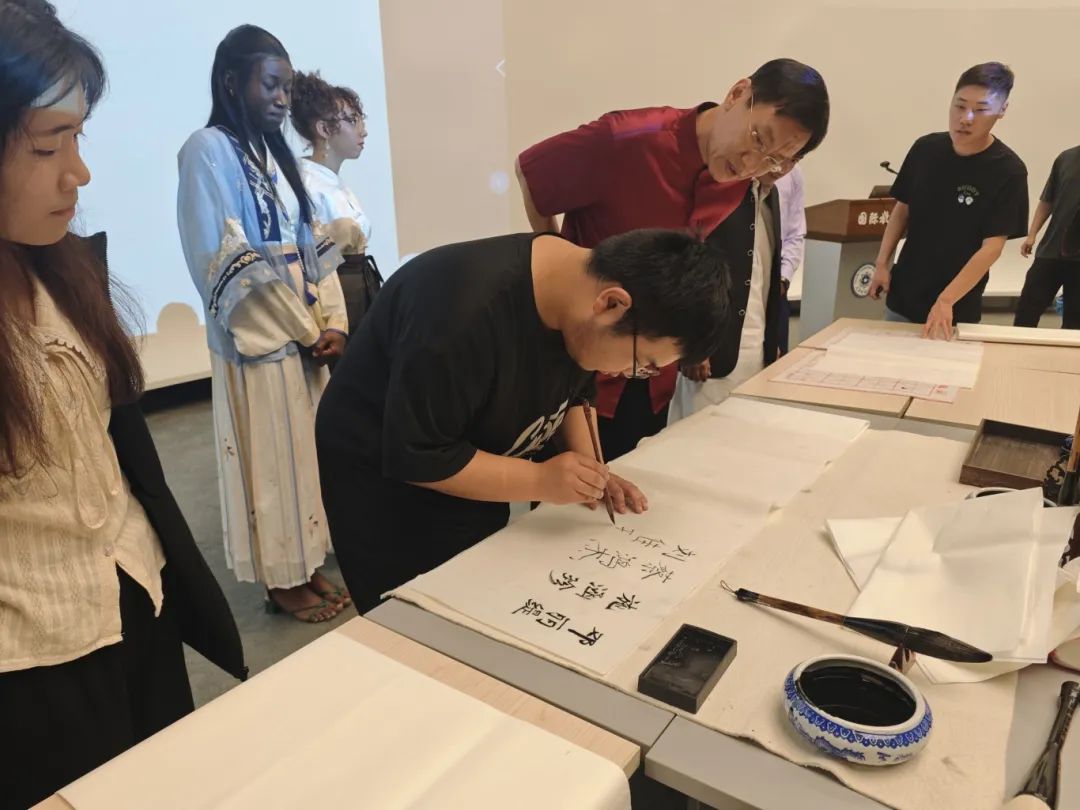 百川老师同现场中外学子一同体验千字文的字字珠玑。留学生们在百川老师的指导下书写汉字,在一笔一划中体验千字文和汉字艺术的魅力。