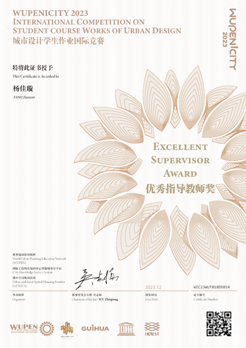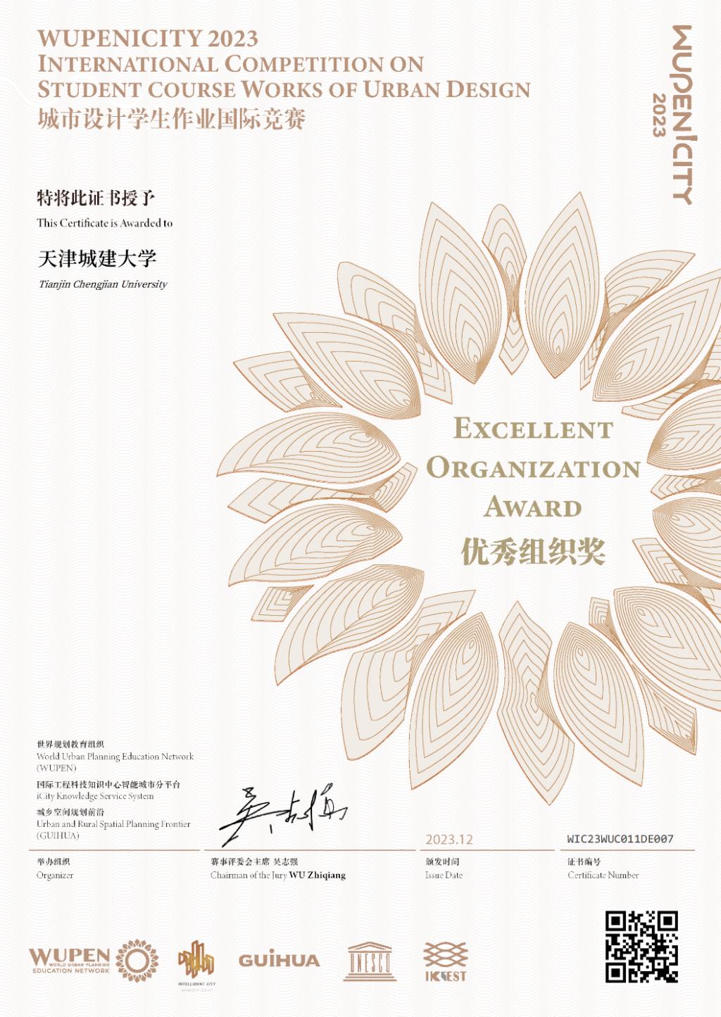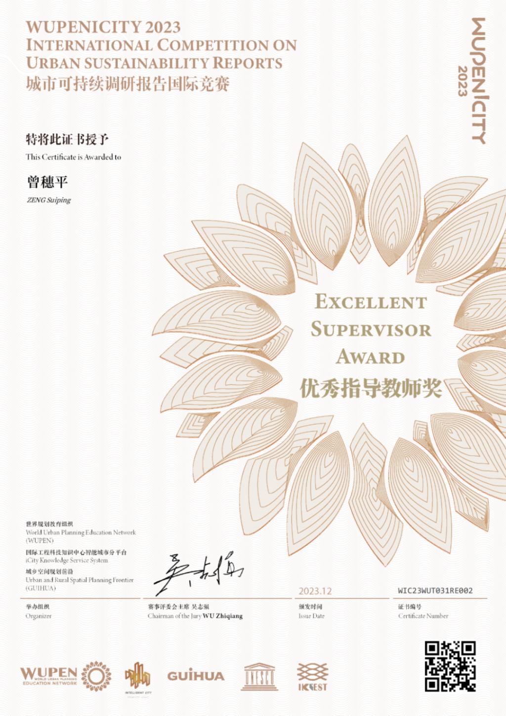 贺信指出,本届国际竞赛组委会共收到符合参赛要求的投稿作品1624份(其中,城市设计学生作业国际竞赛913份,城市可持续调研报告国际竞赛711份),经过两轮专家评审,最终确定获奖名单。bv伟德学生获一、二和三等奖共计6份;bv伟德国际1946荣获优秀组织奖,曾穗平、杨佳璇老师荣获优秀指导教师奖。