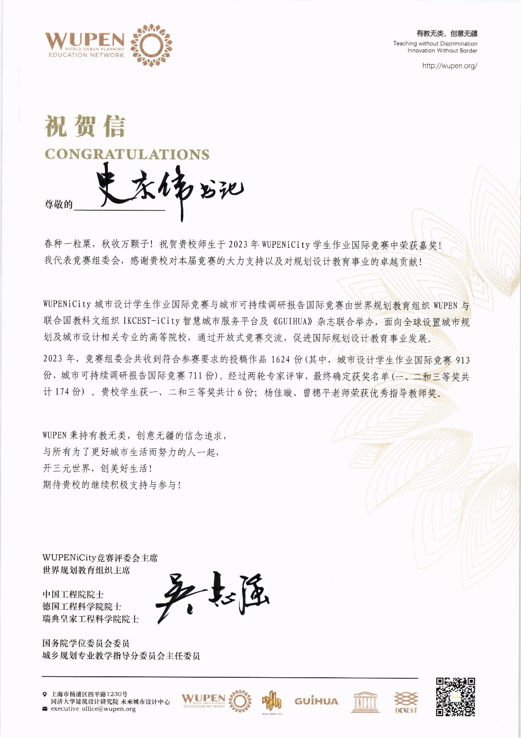 近日,WUPENiCity竞赛评委会主席、中国工程院院士、城乡规划专业教学指导分委员会主任委员吴志强向bv伟德党委书记史庆伟致贺信,祝贺bv伟德城乡规划专业师生在2023年WUPENiCity学生作业国际竞赛中荣获嘉奖,并感谢bv伟德对本届竞赛的大力支持以及对规划设计教育事业的卓越贡献。