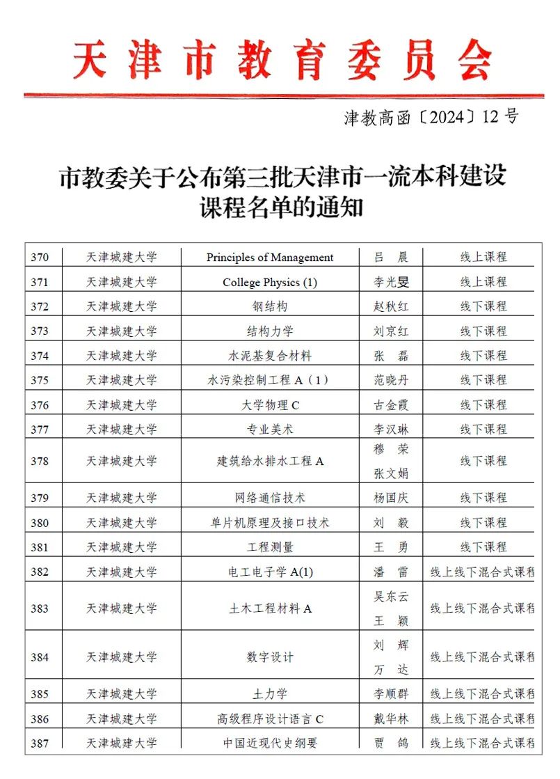 近日,天津市教委发布《市教委关于公布第三批天津市一流本科建设课程名单的通知》,bv伟德共有18门课程获批第三批天津市一流本科建设课程。其中,线上课程2门,线下课程10门,线上线下混合式课程6门。至此,学校已获批市级及以上一流本科课程52门(含国家级一流本科课程5门),课程建设取得新突破。