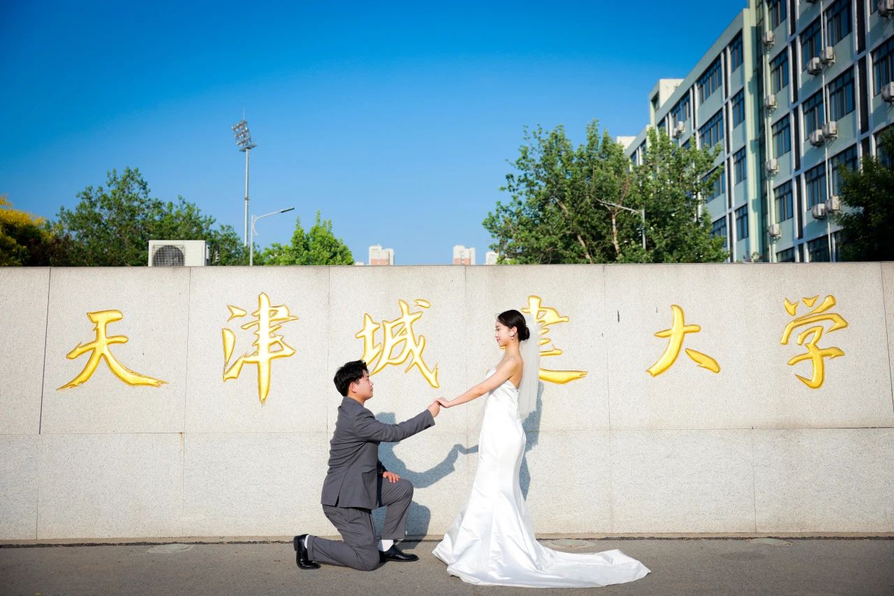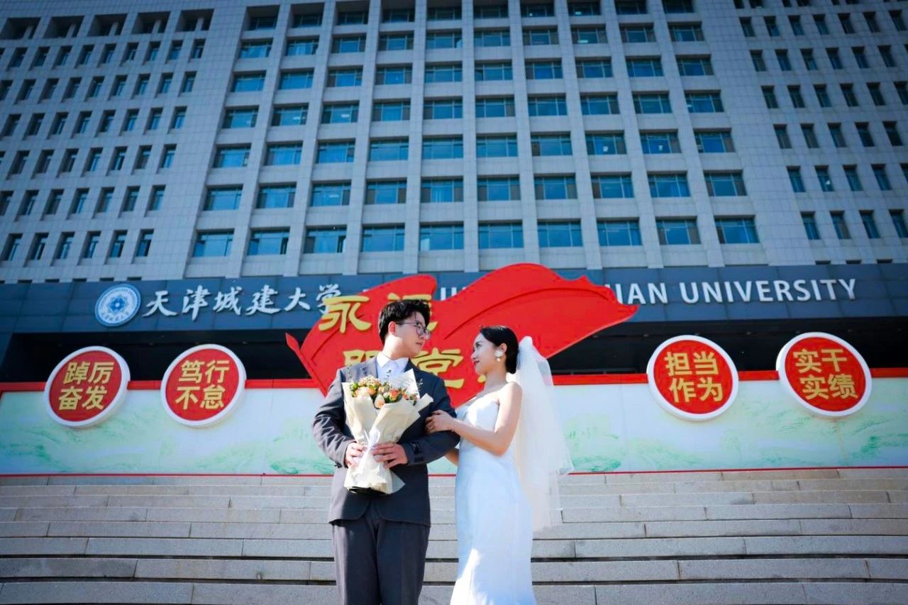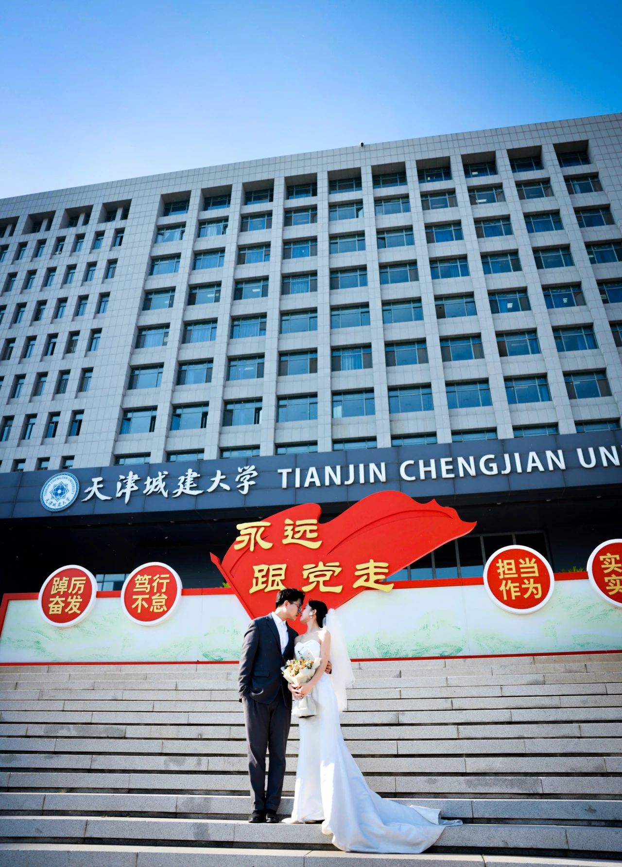王斌、甘雅楠曾分别就读于自动化和工业设计专业,两人相识于学校运动会的团体项目,纯洁美好的爱情让两人走到一起并共同经历7载风雨。更值得一提的是,校友王斌在校期间曾担任班长,是一名品学兼优的学生。毕业后,他响应号召,成为宝坻区史各庄镇朱楼下村一名基层党务工作者——他扎根农村、勤勤恳恳、努力工作,投身乡村振兴的伟大事业中,用一腔热情与所学所习服务广大群众。