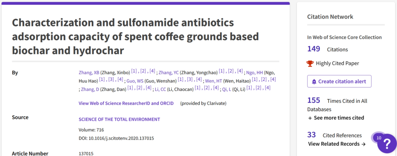 咖啡渣制备生物炭吸附磺胺类抗生素研究