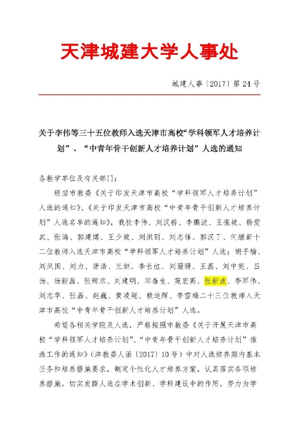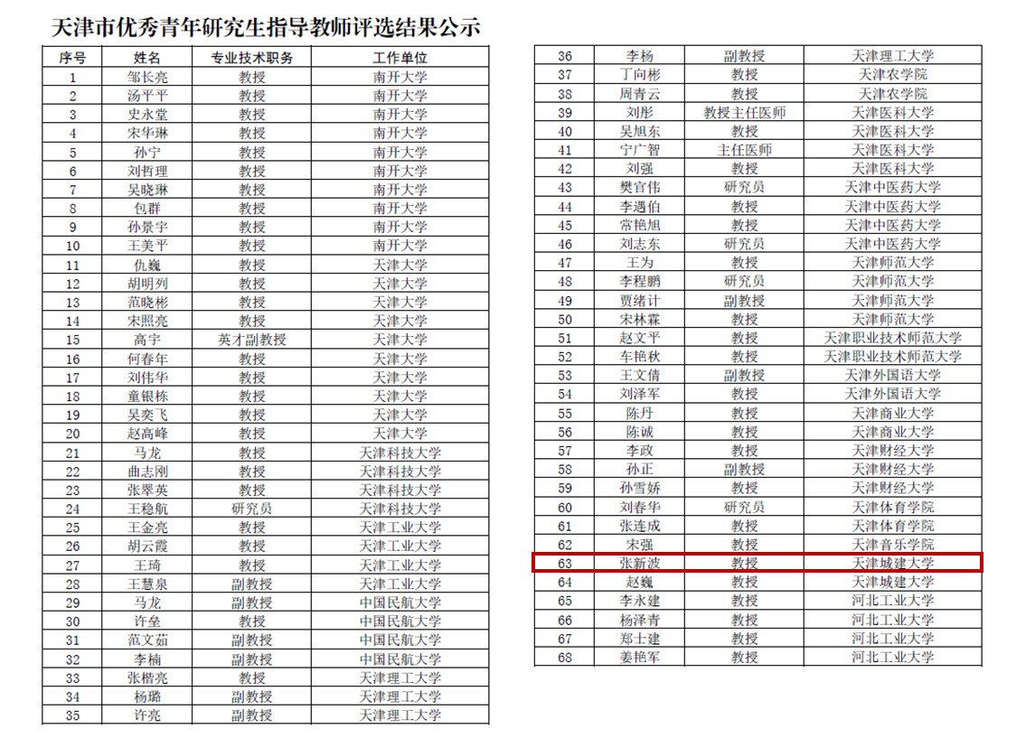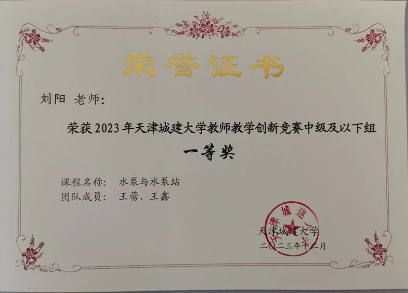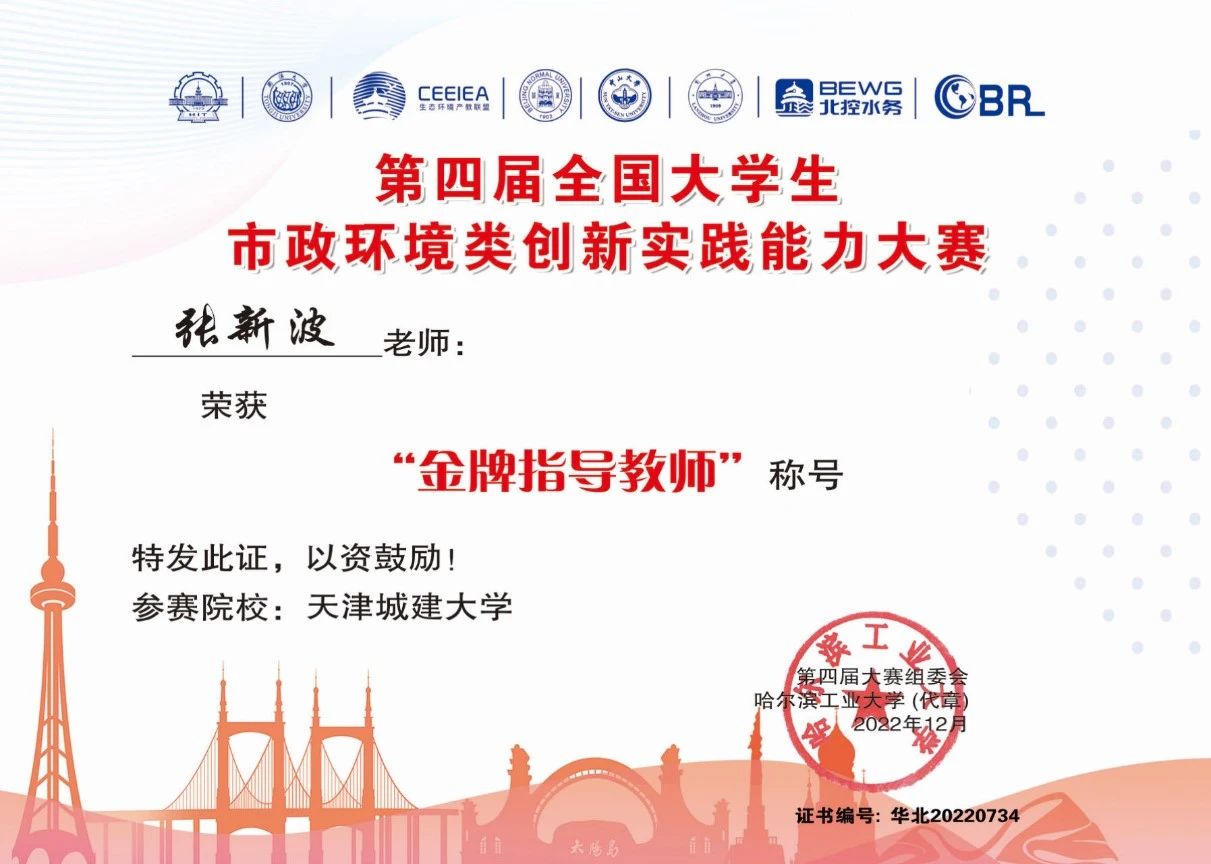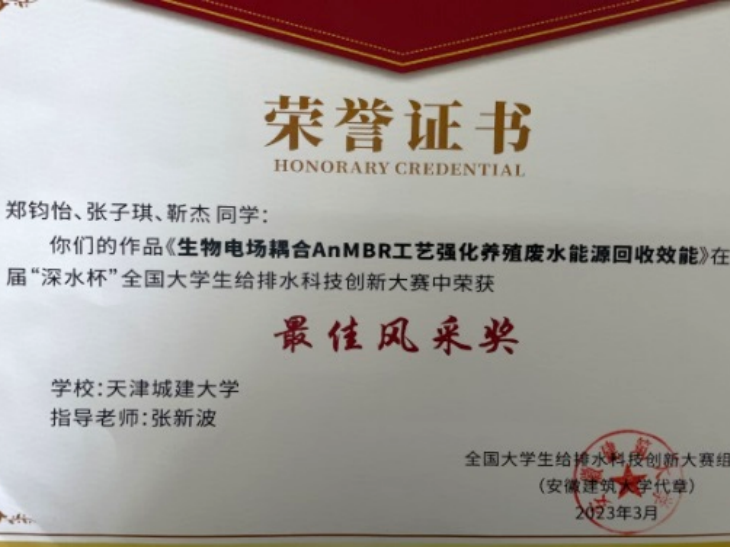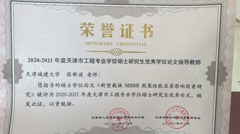 张新波团队注重优化团队师资队伍,提升教育教学质量。张新波教授先后获得天津市优秀青年研究生指导教师、全国大学生市政环境类创新实践能力大赛金牌指导教师、天津市工程专业学位硕士研究生优秀学位论文指导教师等荣誉称号,团队成员先后在天津市和校级青年教师基本功大赛、校级教师创新竞赛、校级课程思政教学竞赛、全国给排水教指委给排水科学与工程专业优秀教学观摩比赛获奖。