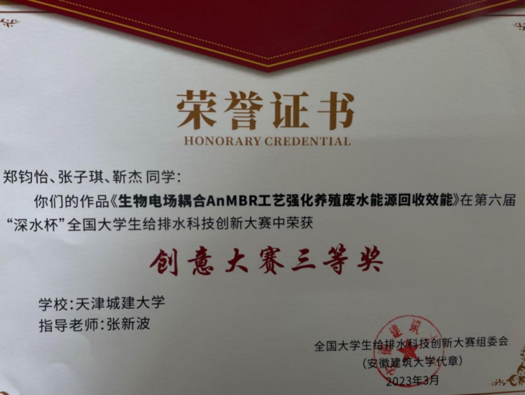 张新波团队注重教科联动、赛教结合,团队老师积极鼓励、指导学生参加创新实践类大赛,培养学生的创新思维和实践能力。团队成员指导学生在“深水杯”全国大学生给排水科技创新大赛创意大赛、中国国际“互联网+”大学生创新创业大赛、大学生创新创业训练计划项目、全国大学生市政环境类创新实践能力大赛等获奖10余项。