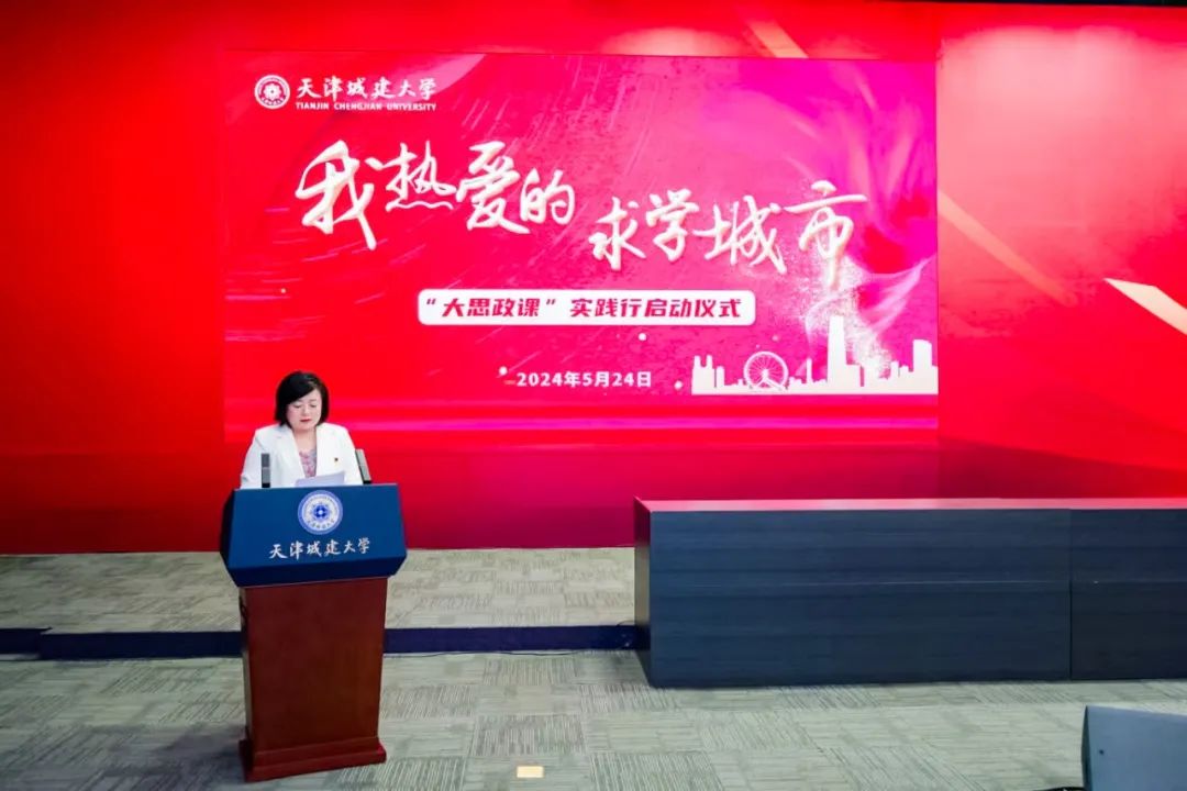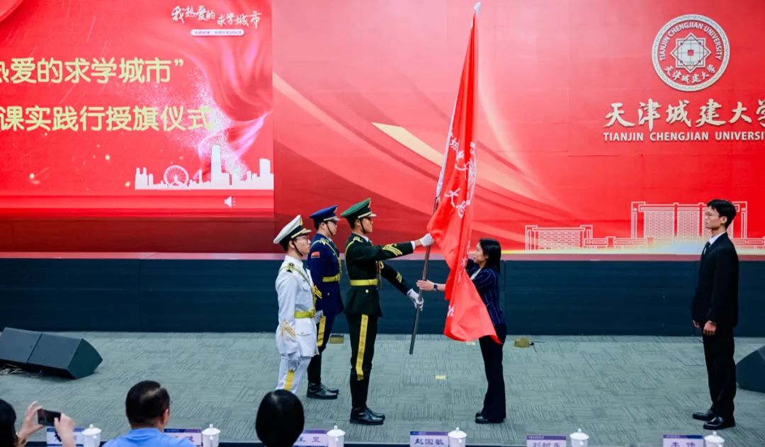 教务处处长赵国敏为“大思政课”实践行学生代表授旗。红色旗帜在学生手中摇动,在报告厅高高飘扬,庄严、热烈的授旗仪式点燃了青春之火,激发了师生从知天津、爱天津到爱党、爱国、爱社会主义的浓烈情感,坚定用奋斗书写青春的底色,用实际行动践行新时代青年的使命。