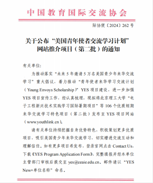 教育部设立“美国青年使者交流学习计划”(YES项目),旨在落实习近平主席提出的“未来5年愿邀请5万名美国青少年来华交流学习”倡议,遴选全国各地各校优质来华交流项目,扩大中美两国人文交流。推荐项目将通过YES项目英文门户网站、我驻美使(领)馆等渠道在美国开展招生宣传,吸引更多美国青少年来华交流学习,促进中美两国青少年互学互鉴,增进彼此了解与友谊。